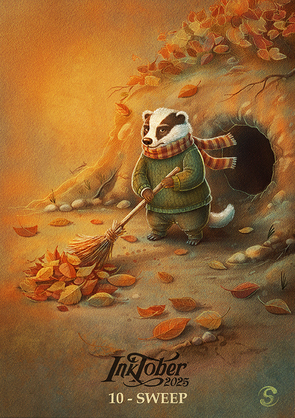 @fabio trop marrant! @Shelter Pas mal pour quelqu'un qui n'a pas trop envie! L'inktober est long et c'est un vrai challenge d'aller au bout ! Il faut accepter juste de ne pas être au top tout le temps. Amuse toi ! @Julie L Belle petite sorcière ! @Gopperus J'aime bien le contraste de la situation ! @ApostroKe La mort qui vient balayer devant nos portes, top ! @Fl0ck0n Cool ! Je te souhaite un bon coup de balai aux soucis pour laisser place au bonheur d'accueillir ton enfant. Courage et plein de bonnes choses ! @daff superbe la référence à Fantasia ! @Image.In.R Une étoile qui fait le ménage, c'est pas courant 😁 Moi j'étais pas trop inspiré et je suis parti sur Monsieur Blaireau devant sa tanière