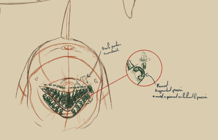 Bonne question. J’avoue que, autant la forme générale de la créature en elle même, mais aussi la position du bébé m’ont fait me poser beaucoup de questions et je m’en pose encore maintenant. Dans un premier temps on ne voyait pas la fin du bébé, il était beaucoup plus de face, donc on ne voyait pas son corps en entier. Et je pensais plus beau le fait de pouvoir le voir en entier. Maintenant c’est surtout l’endroit où il est qui me questionne, je trouve pas que ça fasse particulièrement étrange non plus, c’est vraiment du détail mais j’ai pas réussi à trouver un meilleur endroit. Pour ce qui est de la nageoire tentacule elle est à la maman. Libre ensuite a tout le monde de décider si c’est la continuité de la tentacule du haut, si c’est le bout de sa queue, si c’est une autre tentacule hors-champ… -