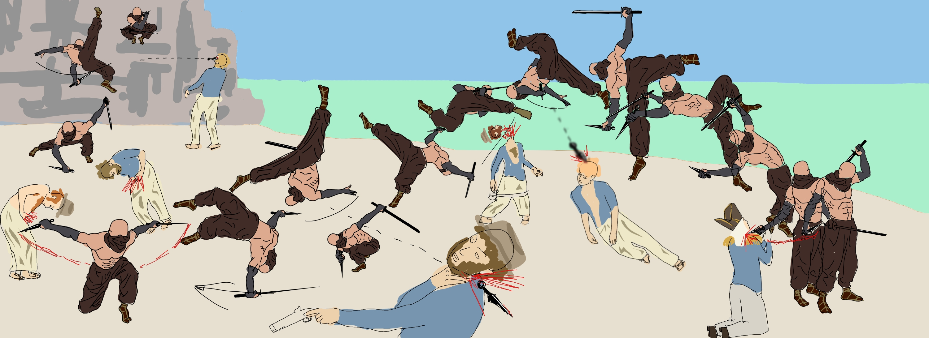 4. Ajout des silhouettes des ennemis, ajustement de leurs positions, et premiers aplats de couleurs. Tout est très grossier, j'essaie juste de savoir si je peux y arriver ou si je dois revoir mes ambitions à la baisse... Je pense essayer ensuite d'aérer l'image davantage en espaçant toutes les positions...