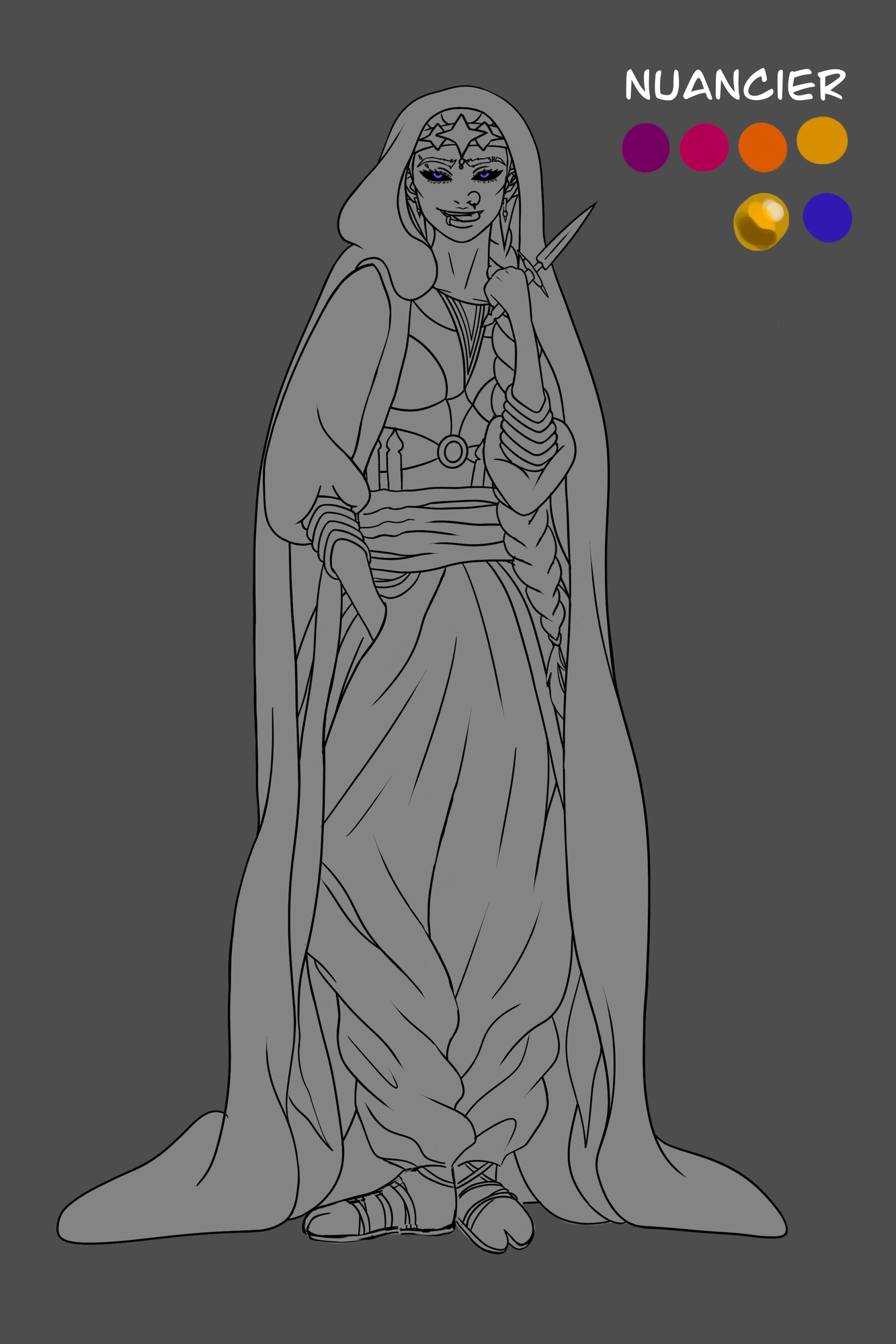 Coucou tout le monde, j'espère que vos projets avancent bien. Moi il faut que j'accélère un peu... Avant de passer à l'illustration finale, je vous montre un peu où j'en suis. N'hésitez pas à me faire des retours. J'ai tout de suite été attirée par la description de Lame Bleue et notamment le côté oriental qui est devenu ma DA principale. Je l'ai imaginé avec plein de tissus, que ce soit dans le décor (qui lui permettraient de se dissimuler rapidement) mais aussi sur elle. Je me tâte encore à lui donner le pouvoir de manipuler les tissus, elle s'en servirait pour lancer ses lames ou bien elle pourrait le faire manuellement, sans pouvoir, ce qui est aussi cool. Il faut aussi que je lui rajoute plein de bijoux parce que bon c'est une pirate quand même... Pour l'illustration finale je pensais la faire en action avec ses bouts de tissus et ses couteaux et son singe sur le dos. Il faut encore que je vois pour le décor mais ce qui est sur c'est qu'il y aura probablement des tapis, rideaux, ...etc. Je veux qu'on ressente la volatilité du personnage, le fait qu'elle soit difficile à attraper, même insaisissable. Donc j'aimerais donner à mon illustration une sensation de mouvement. J'espère que j'y arriverai (je vais essayer). Voilà, avant de commencer je vais faire des tests de couleurs. Merci si vous avez lu jusqu'ici et n'hésitez pas à me donner votre avis. <3