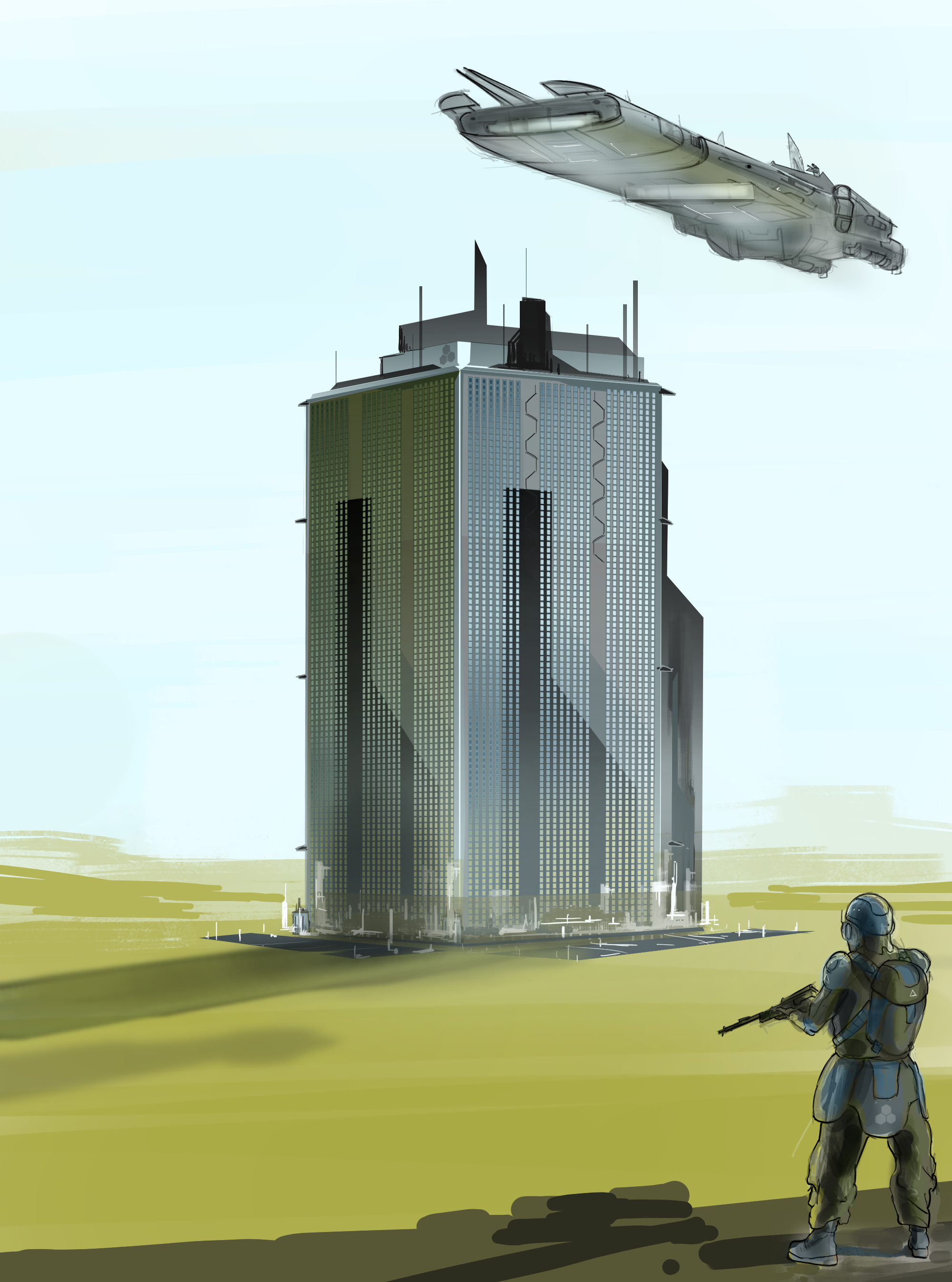 Voici le painting du building pour tester les outils de Transform, perspective, selection, calques etc. J'ai vérifié le placement des ombres dans une scene Blender.