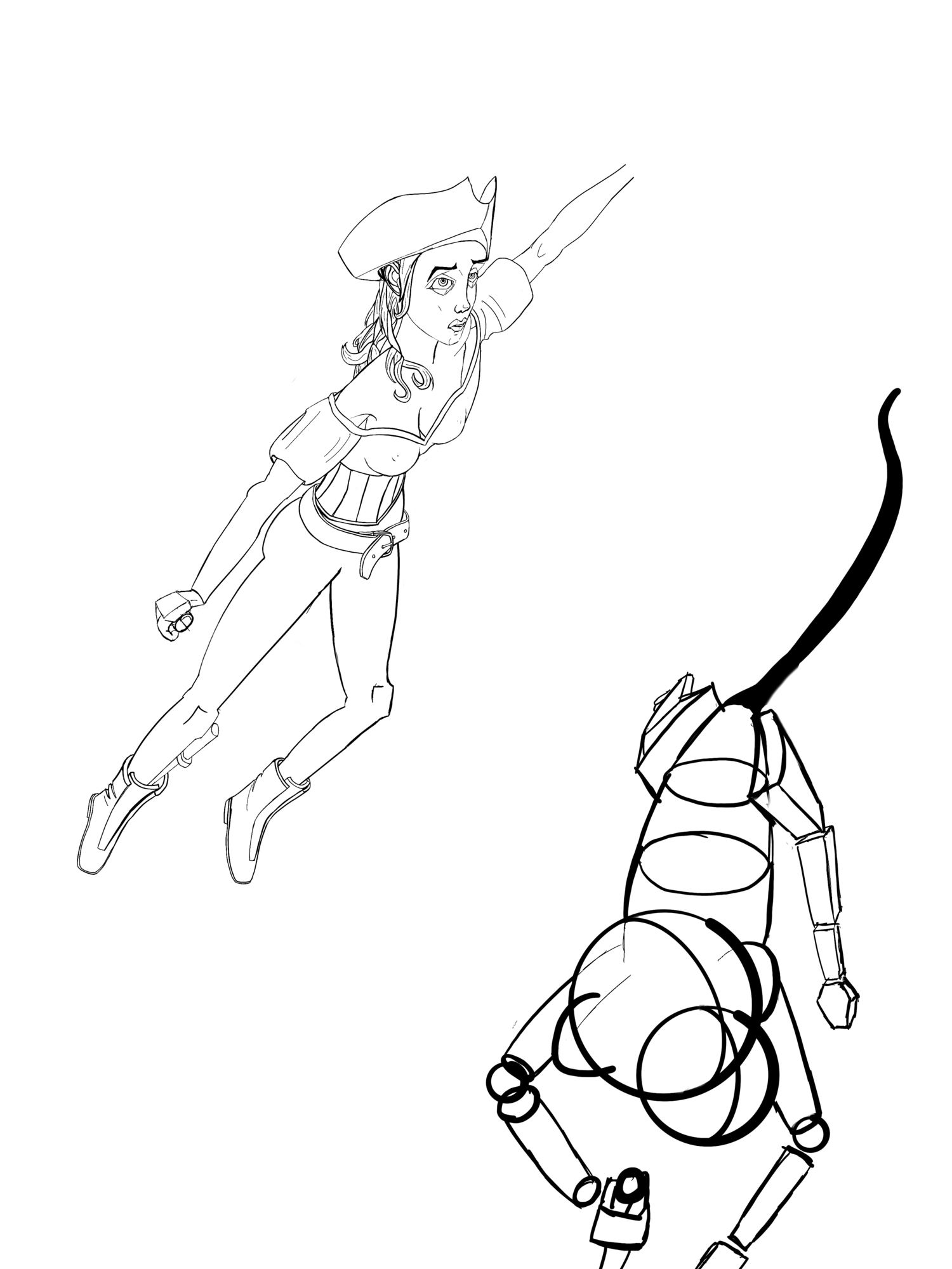 16. Dernier exo de cette partie (compo perso - croquis). J'ai voulu tenté du pseudo splash art, pour tester... J'ai aussi voulu faire une contre-plongée assez forte mais pas encore le niveau suffisant, donc l'image est beaucoup plus plate que ce que j'espérai. A voir comment j'upperai cela en étape 2 !