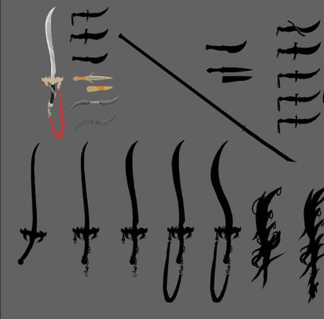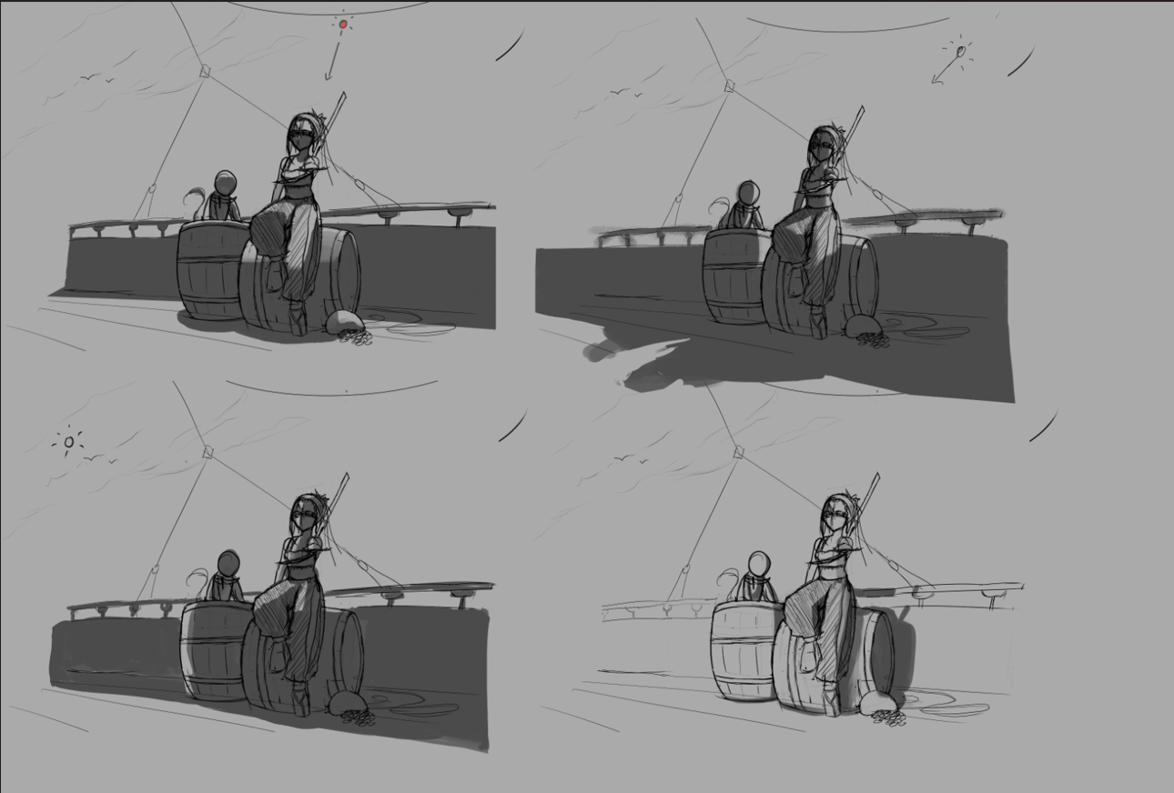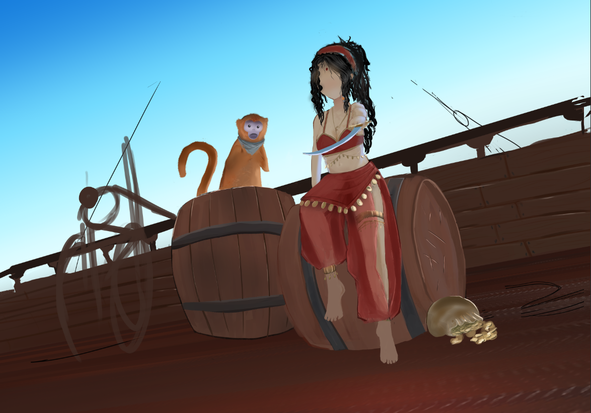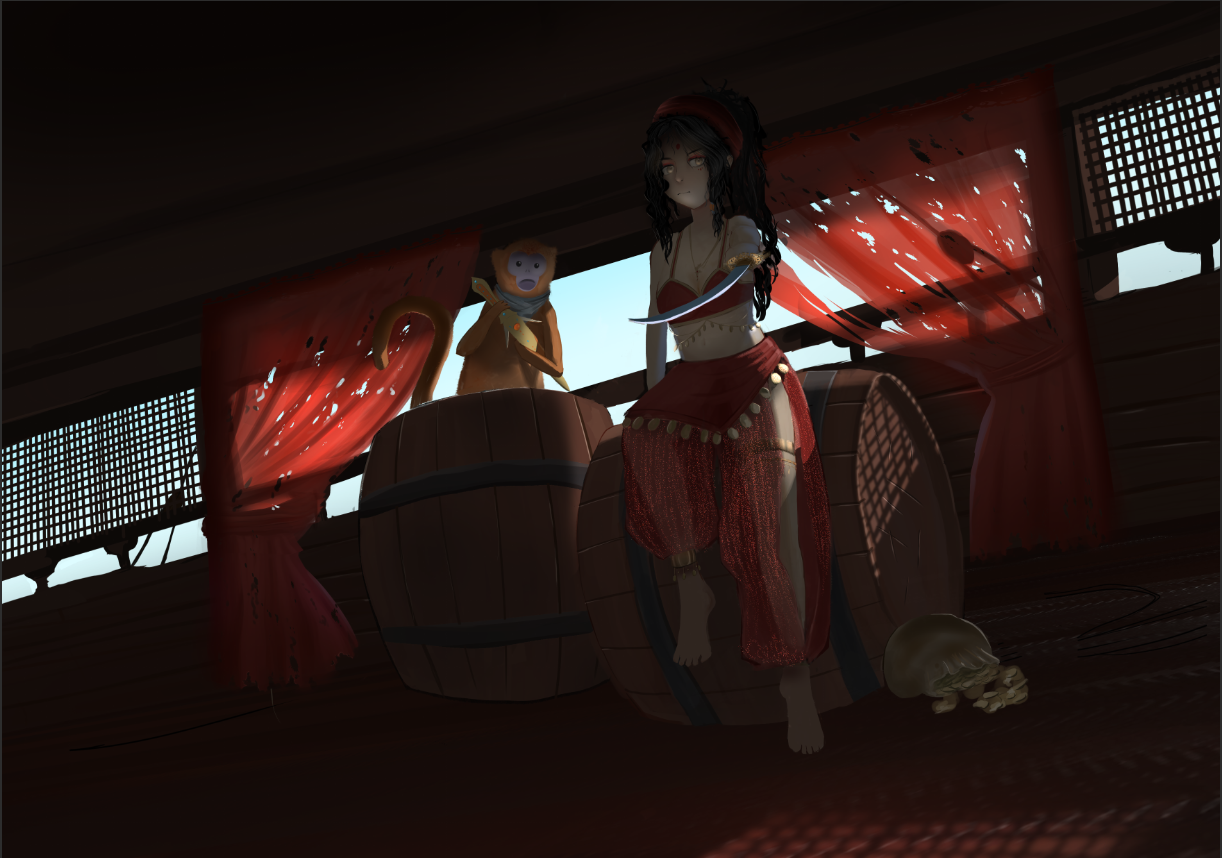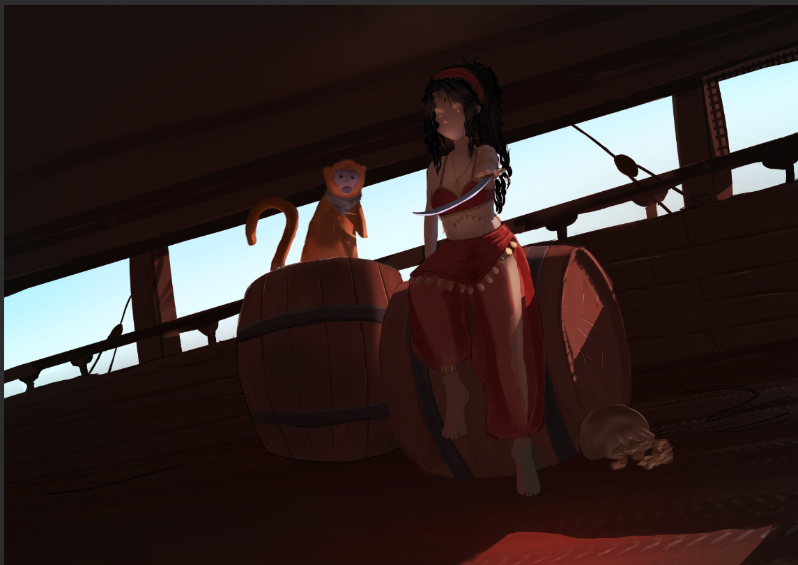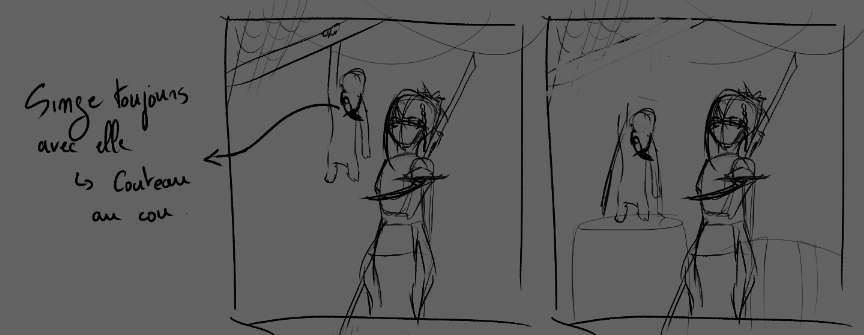 Hello, voici le WIP (rétroactif) de mon illustration de Lame Bleue. D'après son trait "oriental" je me suis assez vite positionné sur un personnage moyen-orient / inde, et j'ai commencé des premières recherches d'armes en travaillant par silhouette, certaines colorées par la suite. Après ça j'ai commencé à réfléchir à la composition. Lame Bleue étant décrite comme une grande capitaine maniant les armes, je suis parti sur une pose de défi. Il m'est assez vite venue l'idée de donner une dague au singe. Puisqu'il l'accompagne en permanence, ça me paraissait intéressant de lui en donner une, qu'il puisse céder à la capitaine en cas de désarmement. Premières idées de compo, je passe au personnage. Même approche que pour les armes, sauf que je travaille moitié sketch moitié silhouette. Ayant une bonne idée de l'apparence du personnage je retravaille la compo. Je trouvais la pose trop statique, et voulais la présenter avec un air plus décontracté pour appuyer le fait qu'avec son expérience, le défi qu'elle lance est insignifiant pour elle. Un peu plus de détails et tests pour l'éclairage. J'ai d'abord opté pour le premier, que j'ai finalement laissé au profit du deuxième après un changement de direction dans l'illustration. A partir de là je vais beaucoup travailler en itération, avec des calques que je duplique, puis fusionne une fois satisfait, ce qui fait que j'ai plus trop accès aux étapes initiales. Dans les grandes lignes : Détails du décors, du personnage, lumière... Je parlais plus haut d'un changement de direction : le pont du bateau me paraissait vide, peu intéressant, et malgré des tentatives d'ajouter des cordage et des montants en bois, j'ai pas réussi à avoir quelque chose qui me plaisait, donc je suis parti vers une scène en intérieur, plutôt côté cabine de la capitaine. Une fois arrivé là, s'en est suivi une longue (trop longue...) phase d'ajustements qui m'ont finalement mené à mon illu !