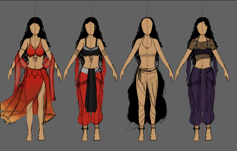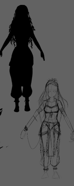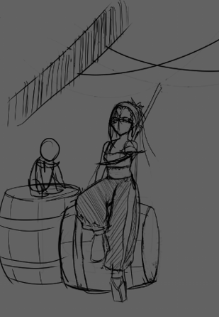Idée ambitieuse en l'état, avec la perspective. L'indication de lumière met bien en valeur le personnage. Hâte de voir la future version, avec quelques cours pour enrichir tout ça ! -
