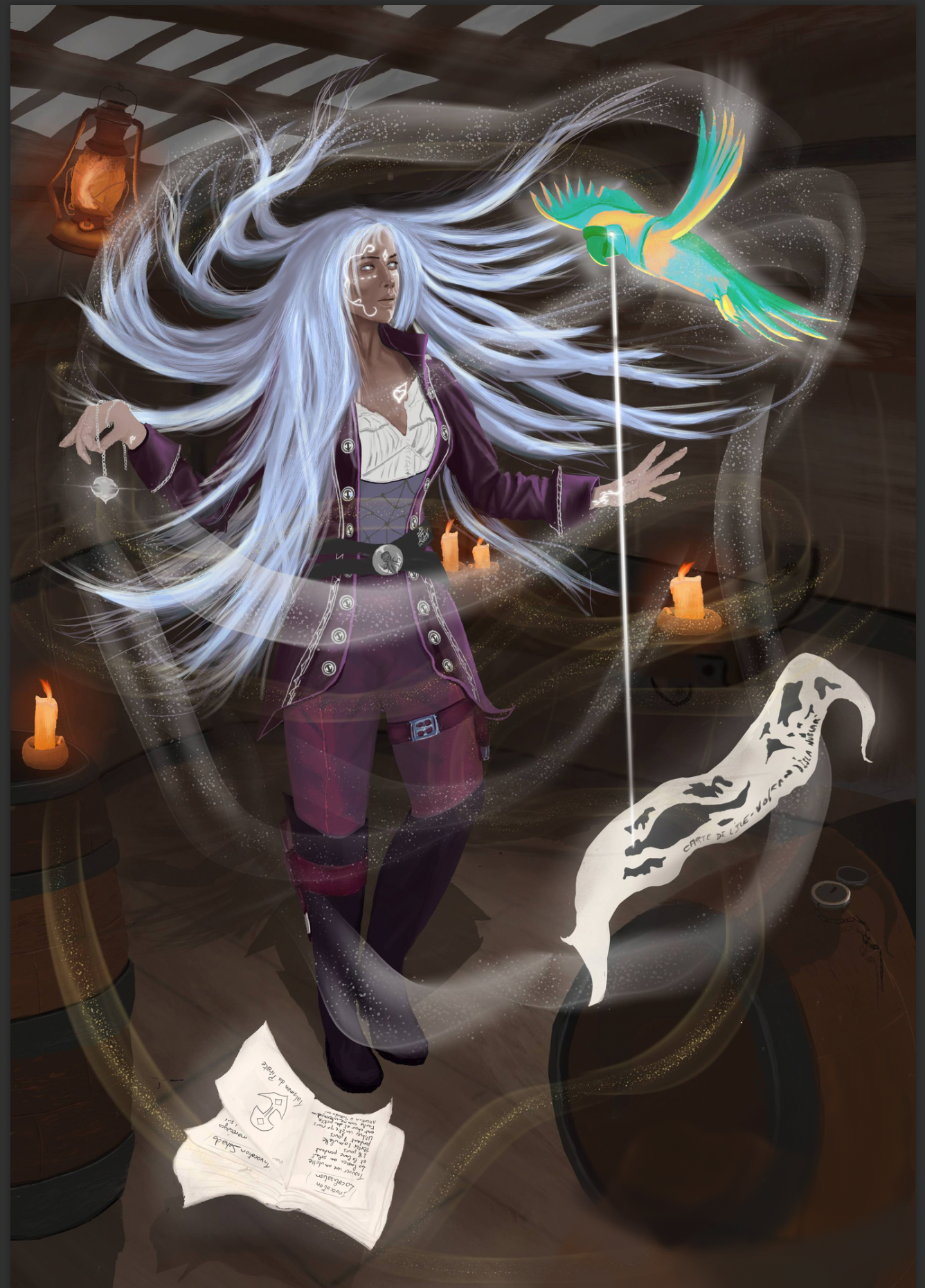 Hello, c'est cool, bientôt finis 👍 pour ma part je pense que c'est mieux que tu ai le focus juste sur le perso et le péroquet, je pense que sakado est pas forcement nécessaire. pour les cheveux est ce qu'ils émette de la lumière ? sinon tu peu ajouter un peu d'ombre sur l'arrière et essayé de simplifier un peu, les petits cheveux charge un peu l'image je pense. Je t'ai fait un test pour que tu vois ce que ça peu donner Bon courage pour la fin !