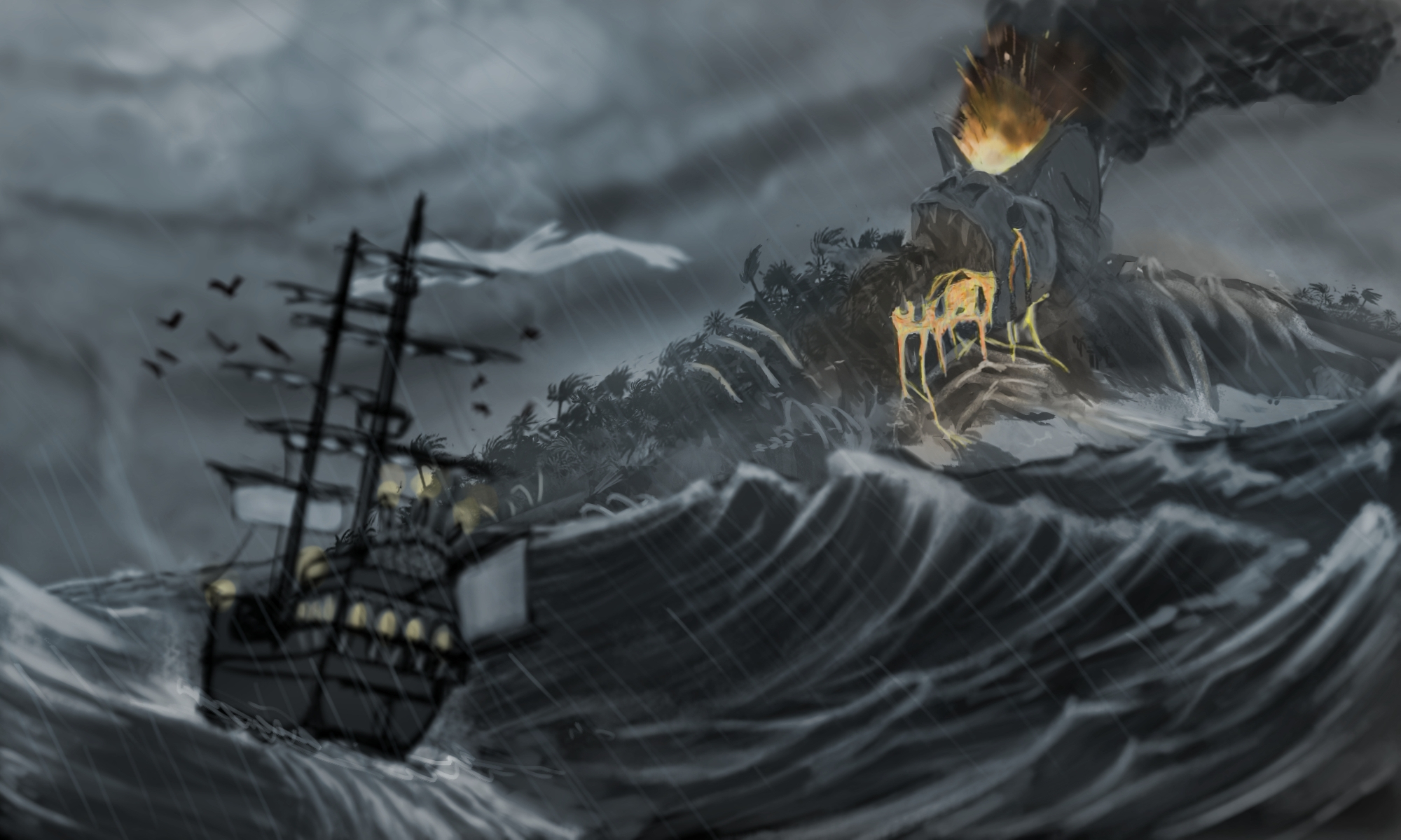 Bonjour à tous. Voilà où j'en suis dans l'illustration. J'ai flouté le premier plan pour mettre l'accent sur l'île. Je galère sur les valeurs et le contraste plus ou moins sombre de l'image. Toutes suggestions pour remettre un peu d'ordre dans cette image sont les bienvenues. -