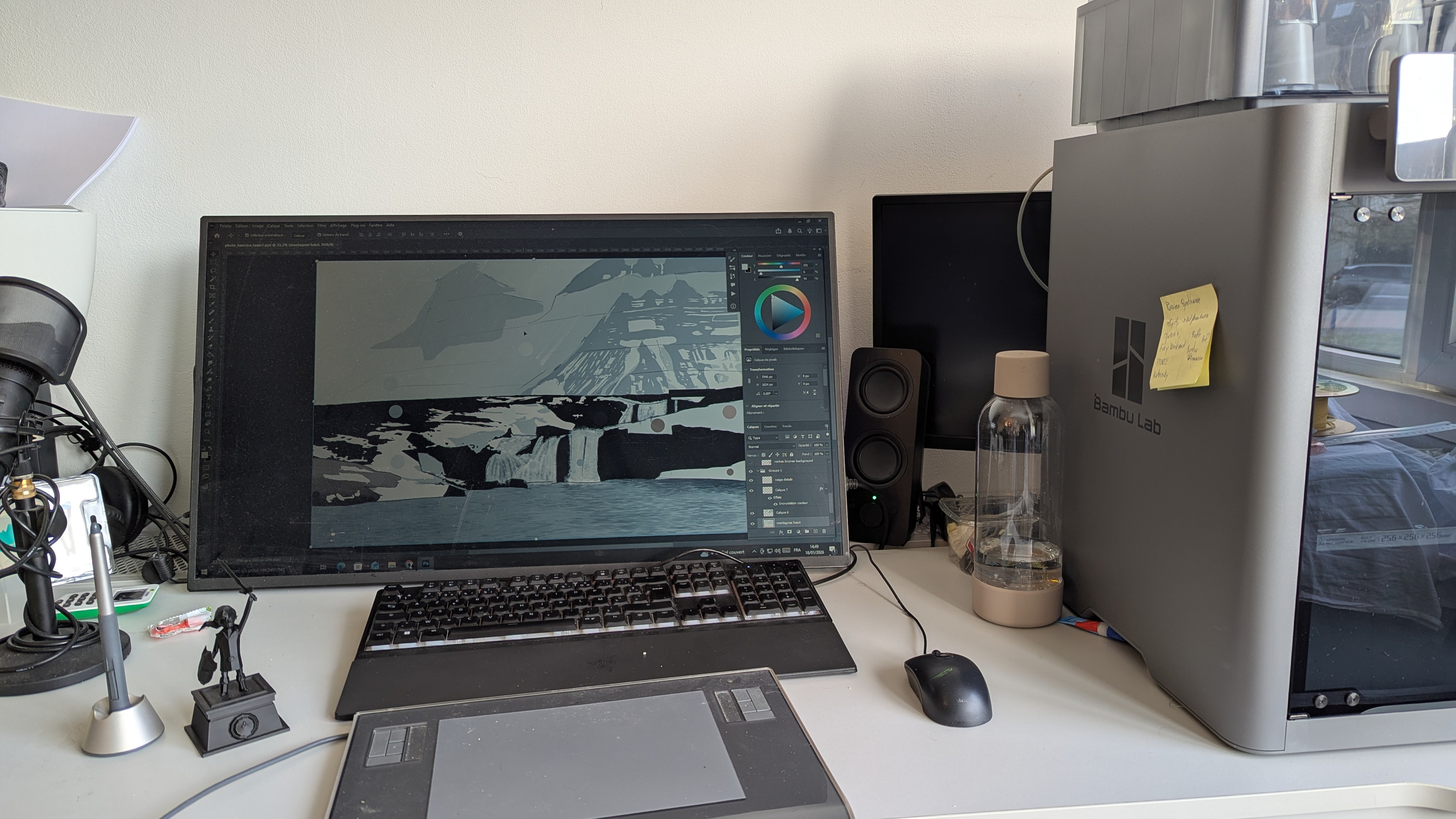 Voici mon petit plan de travail, avec ma wacom intuos 3, photoshop 2026 et mon écran Sunvision (il m'a coûté un bras) qui reflète la lumière (je ne supporte plus les écrans rétroéclairés bien longtemps) J'essayerai toutefois de réutiliser celui de droite pour y placer les outils photoshop. On verra bien. Ah oui, j'ai une tablette 10 pouces e-ink aussi.