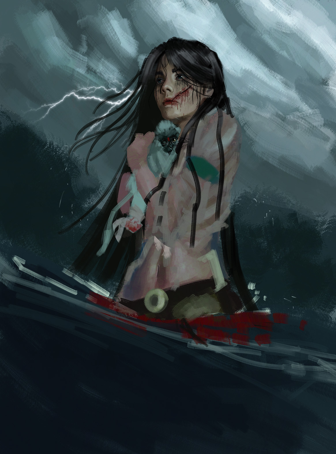 Ce challenge était vraiment sympas et très instructif 😊 Pour ce qui aime bien lire voici une petite histoire sur crève feu: On raconte qu’elle avait souri ce soir-là. Un sourire étrange, malicieux, comme un tison rougeoyant dans la nuit. Elle sentait la présence de sa belle monture au-dessus des flammes, et cette dernière la rassurait. Capitaine d’un équipage brutal et insoumis, Crève-Feu dirige ses pirates avec un mélange de froideur, de violence et d’un grain de folie qui glace même les cœurs les plus endurcis. Son regard vide d’empathie, traversé d’une lueur de brasier, suffit à faire taire une mutinerie avant qu’elle ne commence. Vous l’aurez compris, on ne lui connaît qu’un seul attachement véritable : sa monture. Un immense oiseau de combat que beaucoup appellent, à tort, un “ptérodactyle”. Un animal unique, et presque aussi dangereux qu’elle. Auprès de lui, une bribe d’humanité traverse parfois le masque de violence qu’est devenu son visage. Pour tout le reste, elle est une ombre. Une légende. Une menace. Mais dans certaines tavernes, au fond des ports infestés de pirates, on murmure une autre histoire. Une histoire que Crève-Feu aurait laissée échapper lors d’une nuit de défaite, de solitude et de bouteilles de rhum. « Quand elle était plus jeune, Crève-Feu vivait heureuse avec sa famille dans un village forestier non loin des côtes. Un soir, une nuit sans nuage recouvrait l’île : le vent soufflait, l’air était sec et la lune illuminaient les silhouettes sombres des arbres. Habituellement, au loin, on entendait les chants des villageois : des voix familières, rassurantes. Mais cette nuit, ces sons avaient été remplacés par des cris. Les pirates n’étaient pas venus par hasard. Ils étaient là pour une seule raison : voler les parties du corps d’une espèce d’oiseau extrêmement rare, une créature majestueuse aux plumes pourpres, qui ne vivait que sur cette île perdue. Chaque plume, chaque os, chaque goutte d’huile pouvait se revendre plus chère que la vie d’un homme. Pour s’en emparer, ils étaient prêts à tout raser. Ce soir-là, ses parents moururent sous ses yeux. Les assassins s’étaient ensuite approchés d’elle, ivres de sang et de liqueur, sans voir qu’ils pataugeaient dans le liquide répandu lorsque leurs premiers coups avaient renversé les réserves d’alcool. D’une main tremblante mais résolue, elle alluma son briquet. Le feu fit le reste. Avant de s’enfuir, elle observa les flammes dévorer les monstres qui avaient détruit sa vie. Elle observa ses parents disparaître dans ce même brasier. Le feu l’avait sauvée. Dans cette chaleur suffocante, elle eu l’impression d’être au creux des bras de ses parents, une dernière fois. L’air sec qui s’engouffrait dans la maison nourrissait les flammes. Le brasier devint incontrôlable. La forêt brûlait et le village mourait. Dans sa fuite, au milieu des flammes, elle vit au sol un oiseau gigantesque. Il lui restait encore quelques plumes d’un pourpre étincelant. Ce dernier était mort et dépecé. Une fois plus près de la dépouille, elle vit alors un oisillon blotti contre lui. Ce petit être était passé inaperçu et n’avait pas été tué par les pirates. Comme elle, il était désormais orphelin. Elle le prit dans le creux de ses mains et courut jusqu’à l’océan, éclairée par les flammes du village qui s’éteignait derrière elle. On raconte que c’est ce jour-là qu’elle perdit un œil… et une part de son âme. »