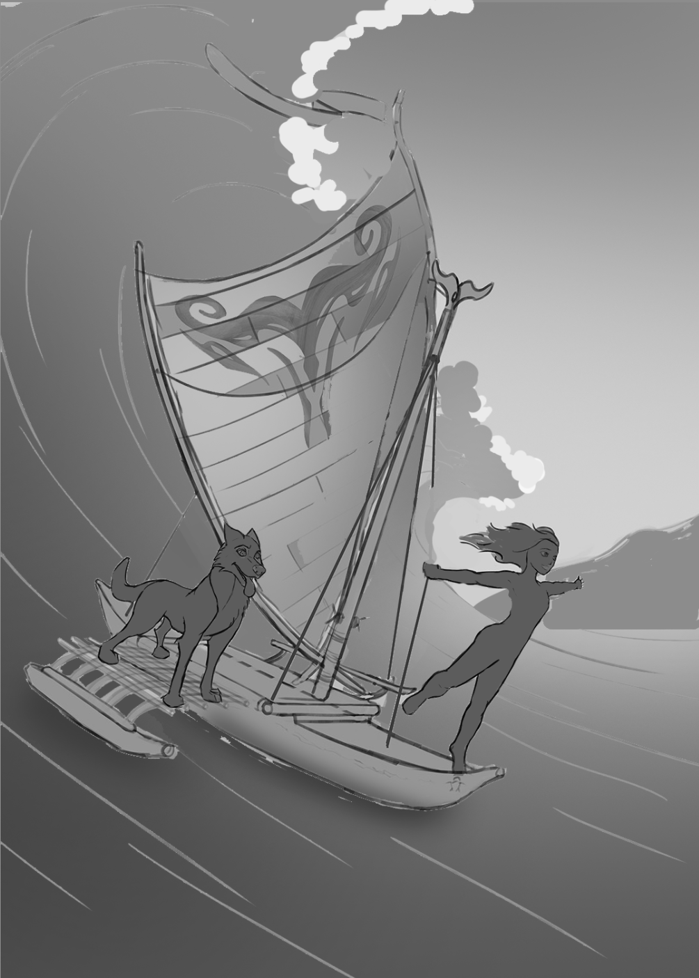 Hello ! Okay je vois bien ! Je pense que comme dans la compo de Vaiana, il faut un peu plus articuler la composition pour mettre en avant la personnage ! Pour ça tu peux un peu descendre la ligne d'horizon, pour qu'il y ait plus de ciel derrière la perso et avoir plus de contraste. L'île peut être plus foncé que l'eau au fond et on peut prendre la même hiérarchie de valeurs pour mettre ta compo en valeurs : Mais je pense que c'est important d'avoir une valeur plus foncée pour ton eau !