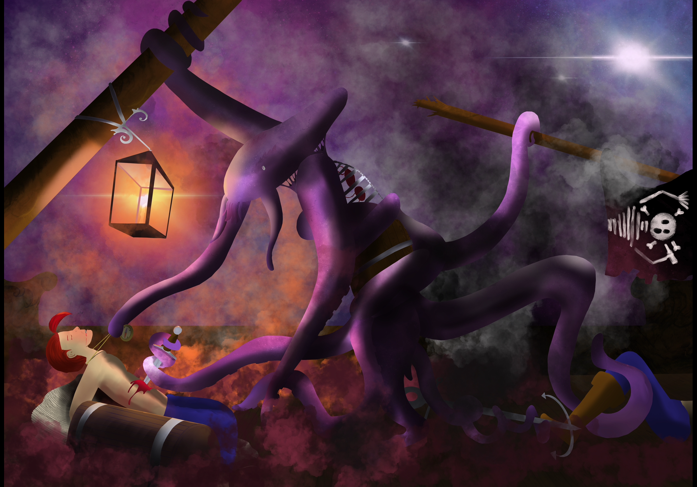 24. Je me suis donc inspiré d'un autre animal marin, mais avec certaines caractéristiques semblables à celle de la pieuvre. A savoir le calamar. Ce qui m'a permis de créer un nouveau design. Une créature au corps de poisson, à la tête d'un mollusque aux mâchoires puissantes et aux tentacules dotées de pinces. Ces dernières lui permettent d'écraser sans efforts tout obstacles.