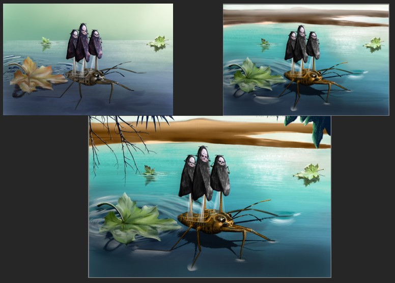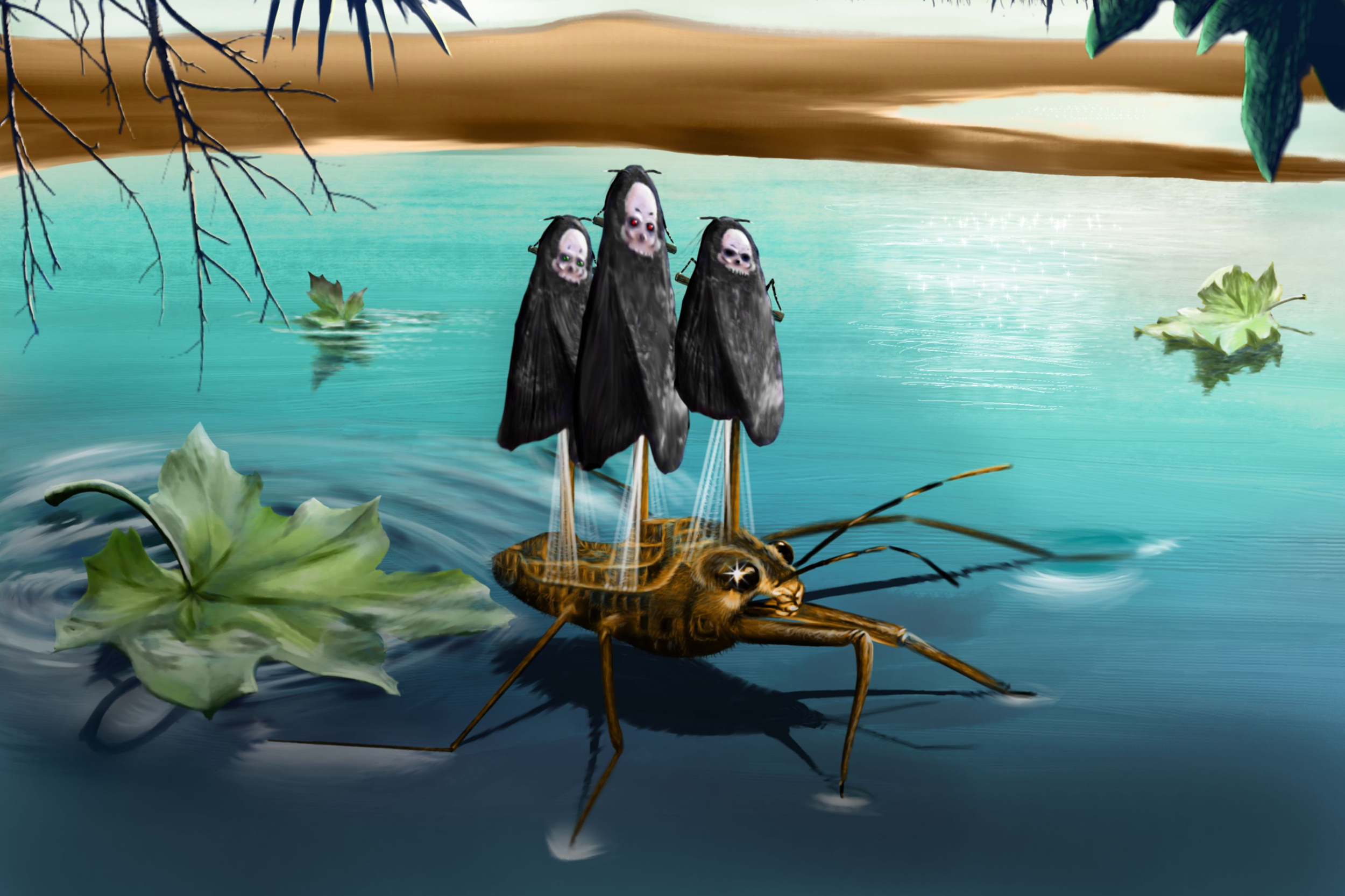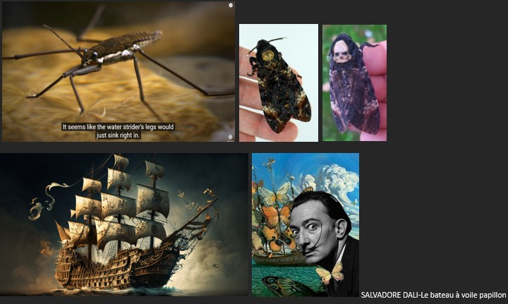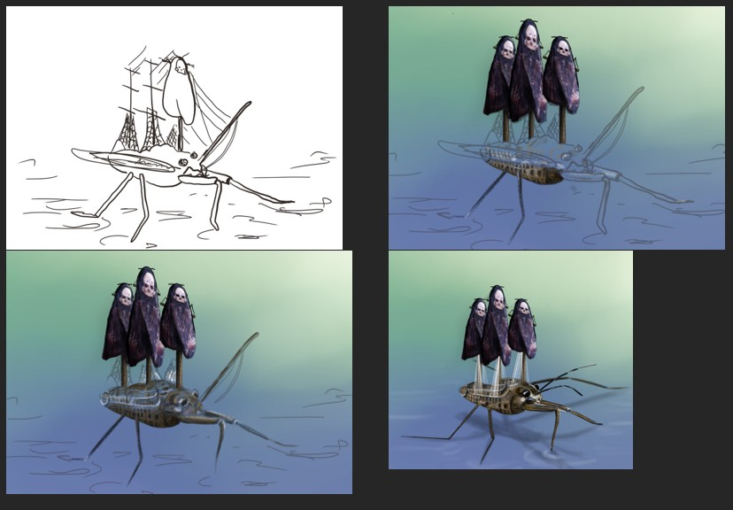 4. Quand j'ai découvert le sujet du challenge j'ai pensé à une créature : un bateau sous forme d'insecte. Plus précisément, je l'imaginais sous la forme d'une araignée d'eau, ou "Gerris". C'est à la fois une maison, un moyen de transport et surtout un être vivant insaisissable et vif. Je me suis demandée comment pouvaient être faites les voiles? Comment pouvaient être faites les attaches du vaisseau?... Je voulais que ce soit avec des insectes aussi. J'ai hésité avec le fait d'utiliser des araignées mais ce ne sont pas des insectes ... Je me suis donc inspirée des papillons à tête de mort que l'on appelle les "Sphinx", et comme ils savent produire de la soie, je fais d'une pierre deux coups : des voiles et des cordes. Le navire est dirigé par les trois Sphinx tête de mort : le leader, le penseur et l'exécuteur Ne vous fiez pas à la petitesse de leur corps, leurs âmes renferment l'essence de redoutables pirates.
