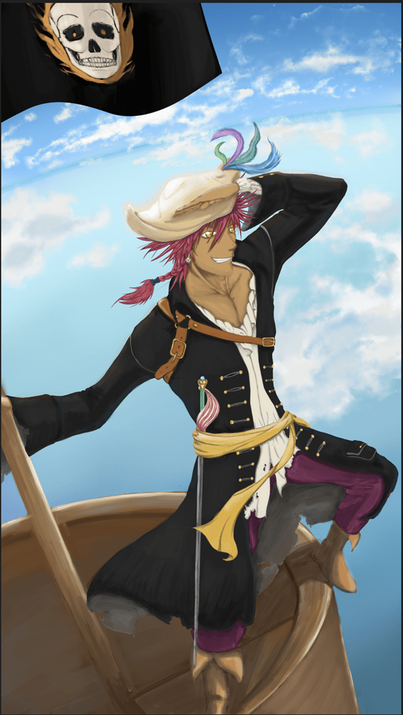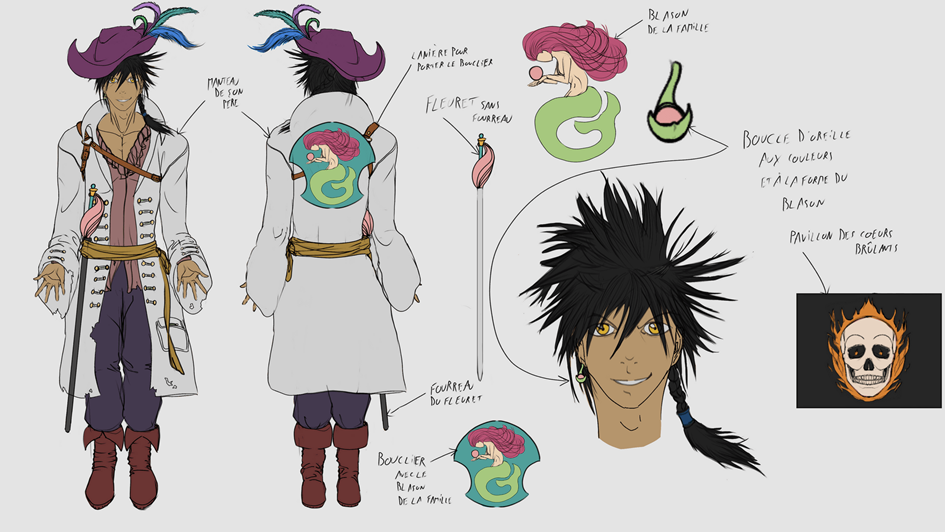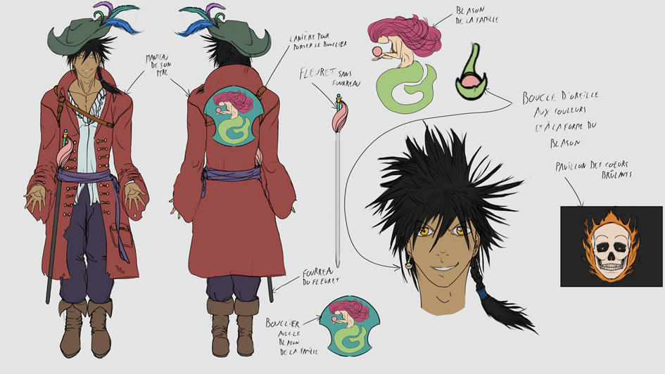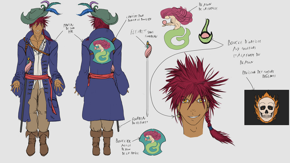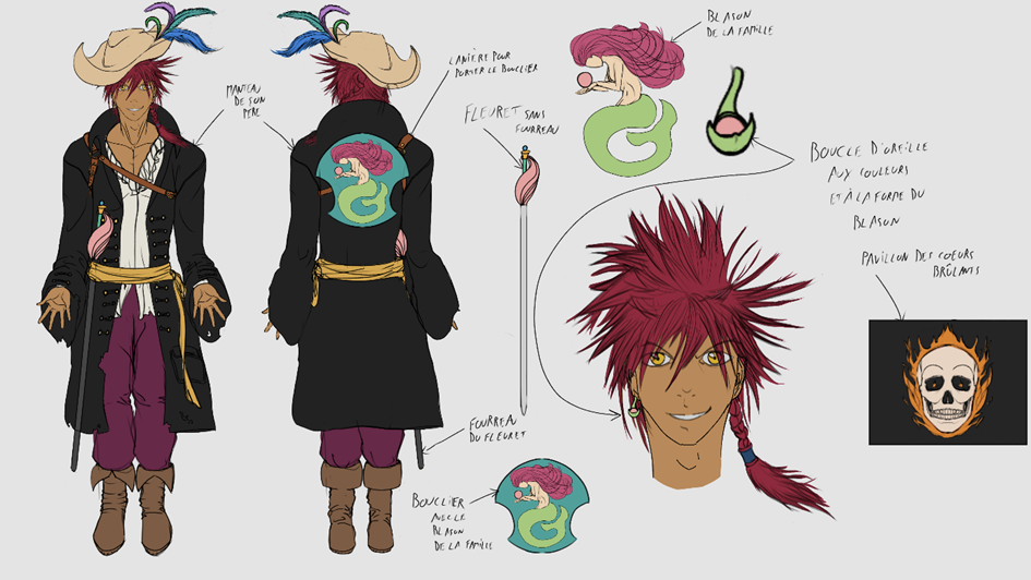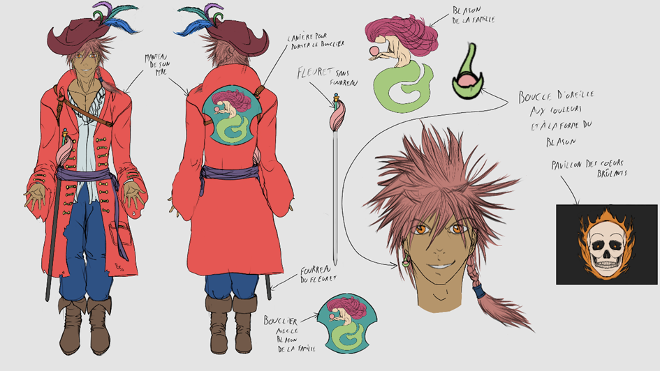 6. Salut c'est ma première participation à un challenge DPS j'espère que le résultat final vous plaira ! ^^ Pour commencer j'ai fais pas mal de recherches sur les pirates ça m'a aidé à trouver l'inspiration et explorer des concepts, pour les tenues, les armes, accessoires, poses et logo pour le pavillon et le blason de la famille : j'ai fini par faire un concept art : j'ai exploré ensuite d'autres couleurs : j'ai fini par opter pour cette palette de couleur : je voulais qu'il ait vraiment un regard ardent et un tempérament de feu d'où les couleurs avec le pavillon à son image Pour le fleuret, le bouclier et la boucle d'oreille j'ai fait en sorte qu'ils soient assortis au couleur du blason de la famille puis j'ai commencé mon illustration ; j'ai fais plusieurs sketch exploratoires là aussi j'ai choisi la dernière pose avec une perspective à 4 point de fuite pour rendre l'image plus dynamique et mettre en valeur au mieux le personnage les autre poses étaient immersives mais cachaient une partie du visage du personnage et ça ne me convenait pas j'ai fait la line du personnage, la colo flat globale, la colo de la line, les ombres + occlusion ambiante, les lumières, les reflets sur l'eau, les lumières sur le pavillon les changements de couleurs sur les cheveux, le pantalon et la lanière du bouclier l'ajout des oiseaux pour apporter de la vie à l'illustration et au décor Les effets de halo et de légère surexposition et enfin j'ai augmenté intentionnellement la vibrance de l'image (quitte à saturer un peu plus les couleurs) pour que ça corresponde avec l'atmosphère vivifiante, joyeuse et dynamique que j'avais en tête dsl pour la qualité de l'image, les couleurs ne rendent pas aussi bien sur la version compressée que celle qui se trouve sur ma participation au challenge Voilà ça sent l'aventure tout ça ! si vous avez des critiques constructives (positives ou non) à me faire je suis preneur ! ^^