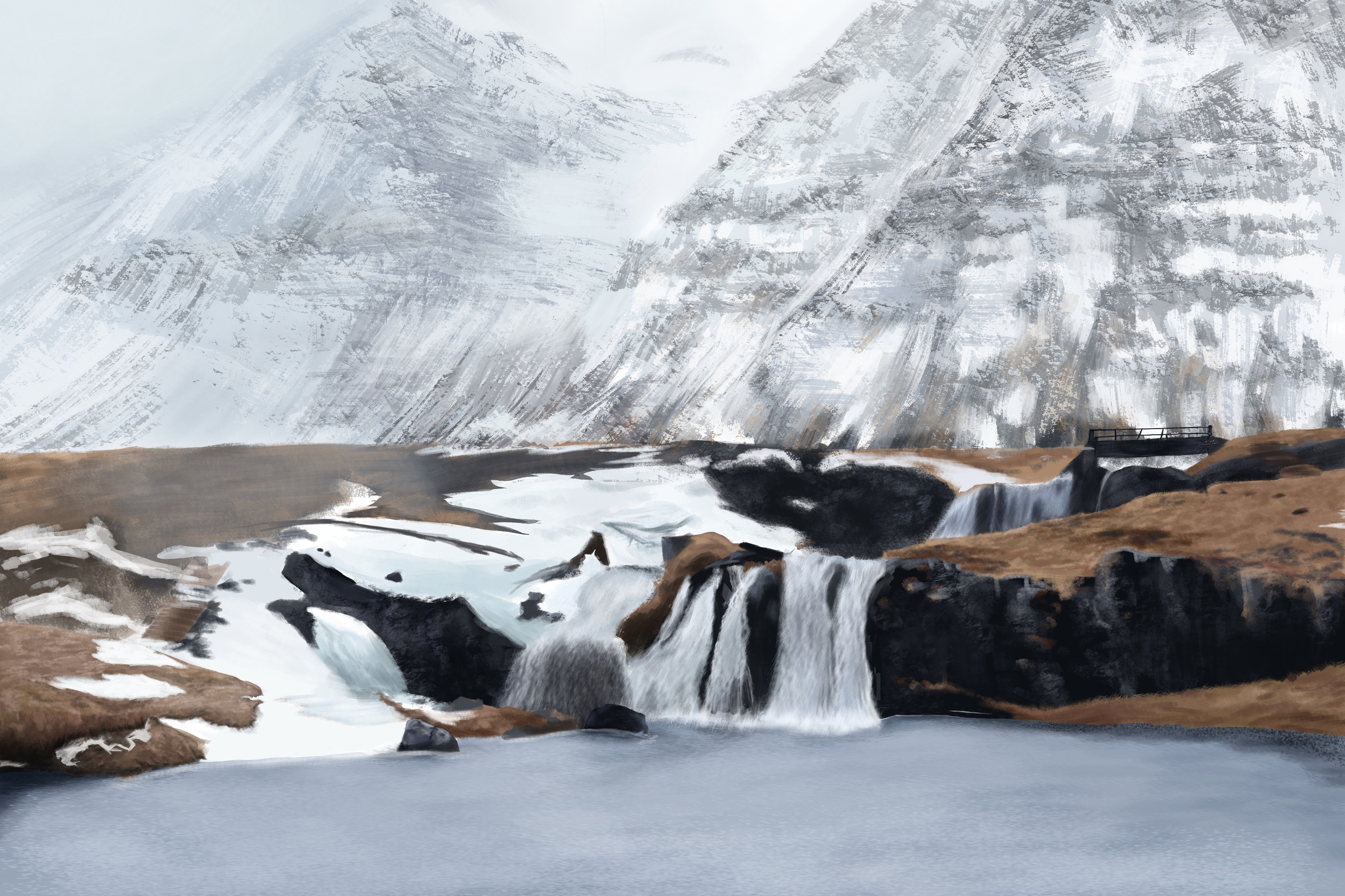 Bonjour 😄 Merci pour tes retours, effectivement, j'avais pas remarqué que les buisson se détachaient trop de la montagne ! Je pense que j'ai réussi à corriger ca. Pour ce qui est de l'herbe, j'ai tenté mais j'ai pas l'impression que se soit mieux, j'ai essayé de foncer les zones d'ombres mais ca faisait pas très naturel. C'était trop sombre. J'ai aussi rectifié la perspective des montagnes, du pont et j'ai aussi rectifié la séparation des deux montagnes, je sais pas si ca rend mieux.