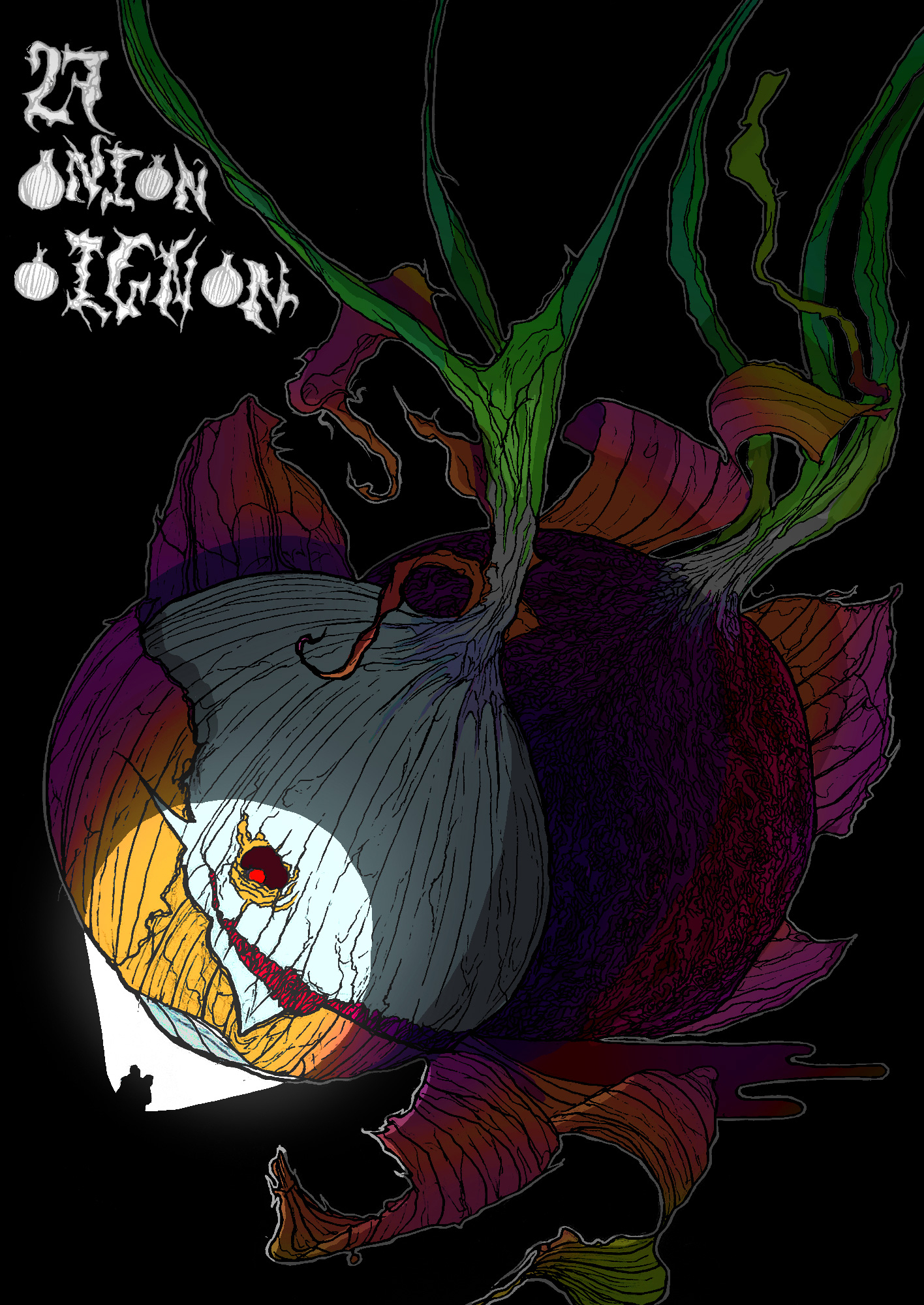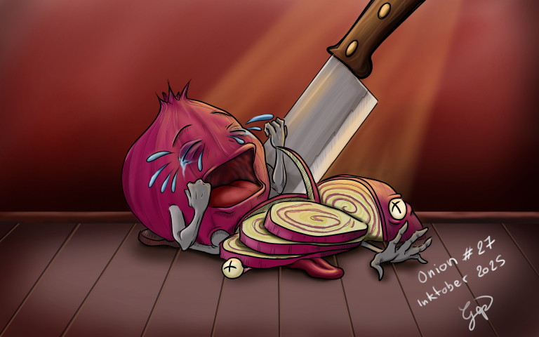 Bonjour tout le monde ! @Gopperus Quelle performance je suis impressionné ! Et en plus les effets spéciaux sont très bien réussis ! Super scène ❤️. Pour ma part voici ma participation. Des oignons.... Bon c'est bien la première fois dans cet Inktober que je n'avais pas d'idée pour faire quelque chose dans l'ambiance d'Halloween 😅. J'ai cherché des symboliques partout pour avoir de l'inspi mais vraiment rien d'intéressant. Du coup carte joker : je fais appel à des potes pour me balancer tout ce qu'il leur passe par la tête. Ça m'a ramené à la base de ce que j'aime bien faire : faire des monstres avec tout et n'importe quoi ! Du coup ce sera un oignon géant coupé en deux, avec des yeux et dont l'intérieur est rempli de sang et d'amas de formes plus ou humaines (même si on ne voit pas trop à cause de l'obscurité). Il doit faire pleuré du sang probablement...