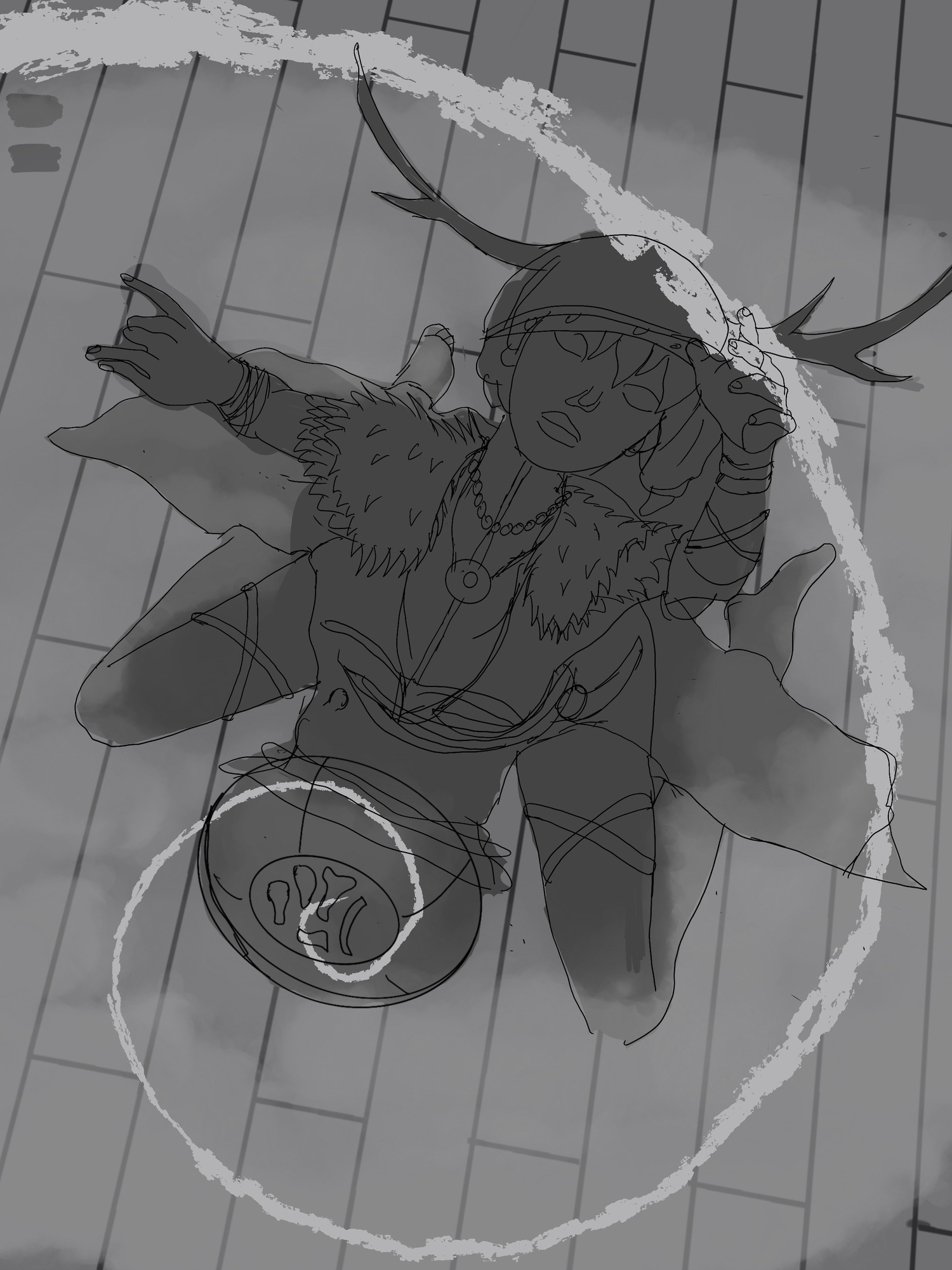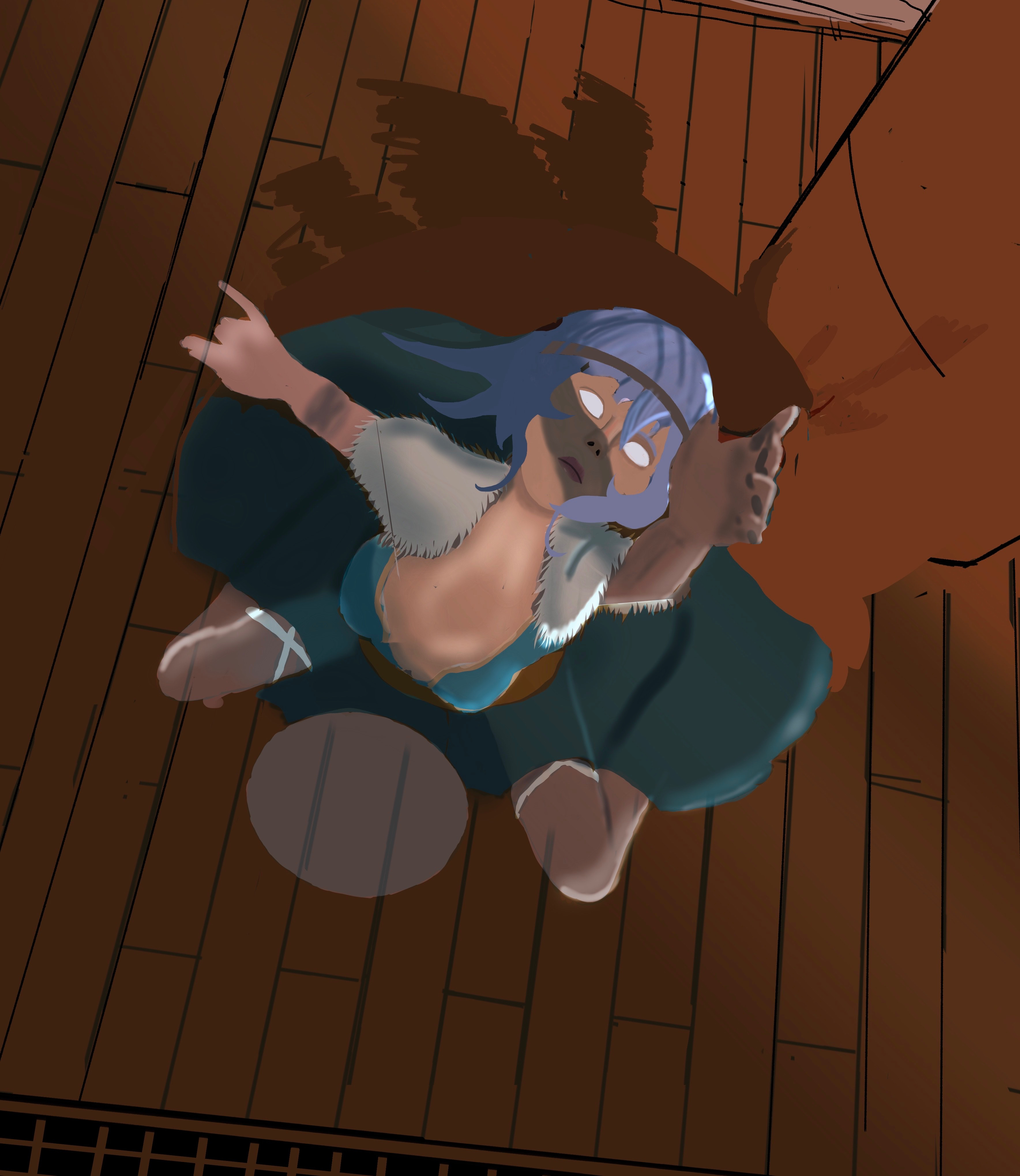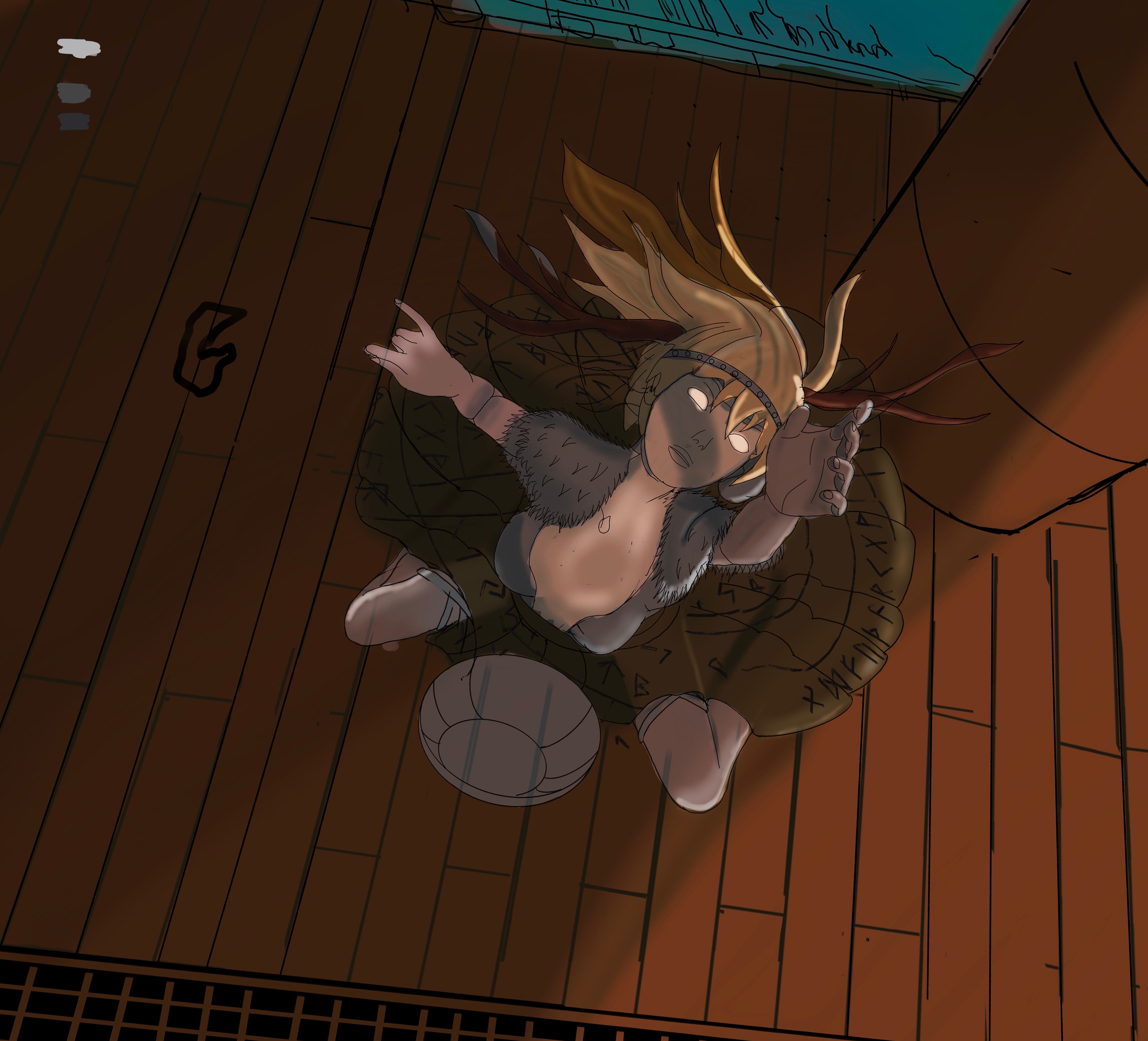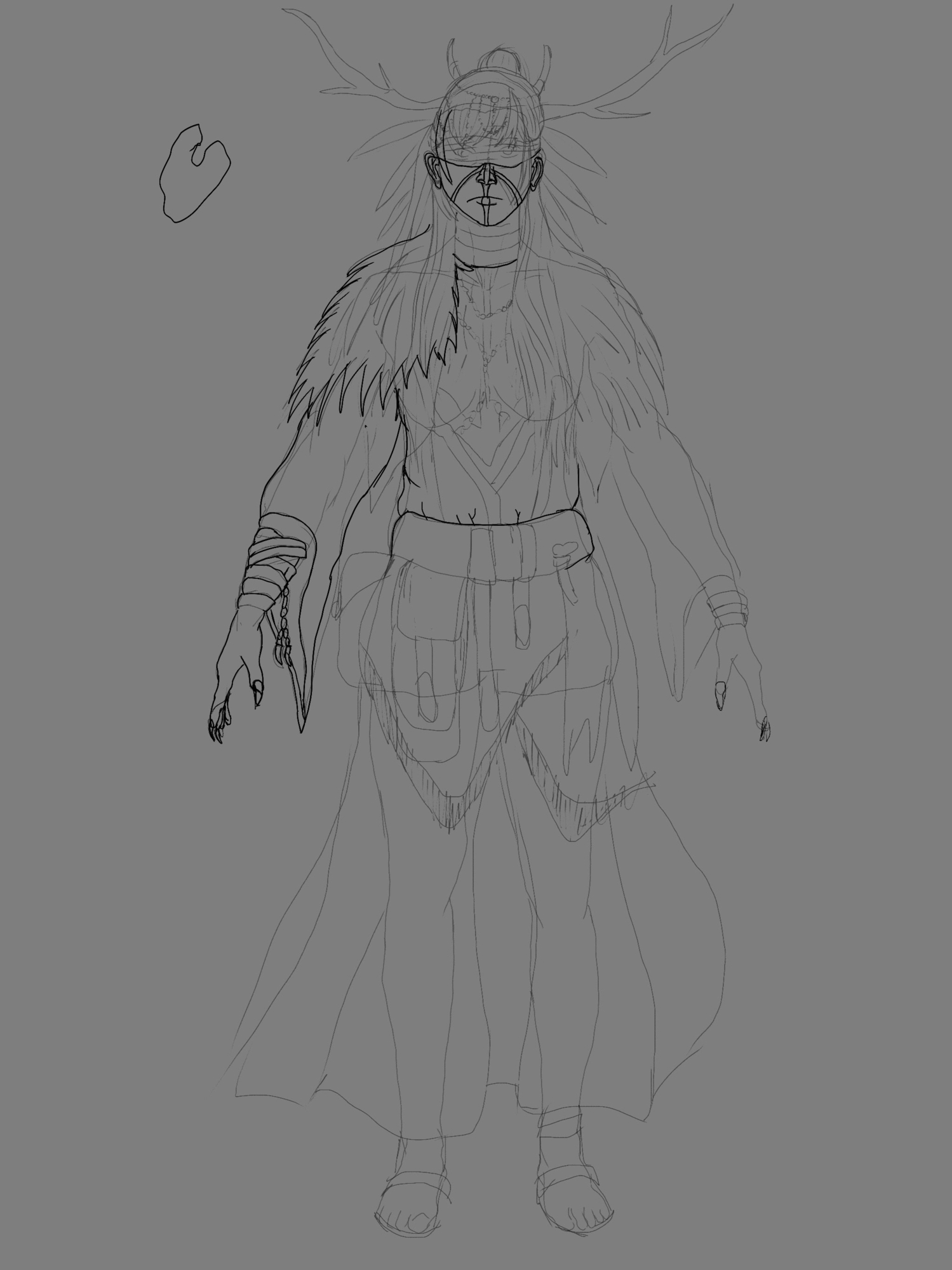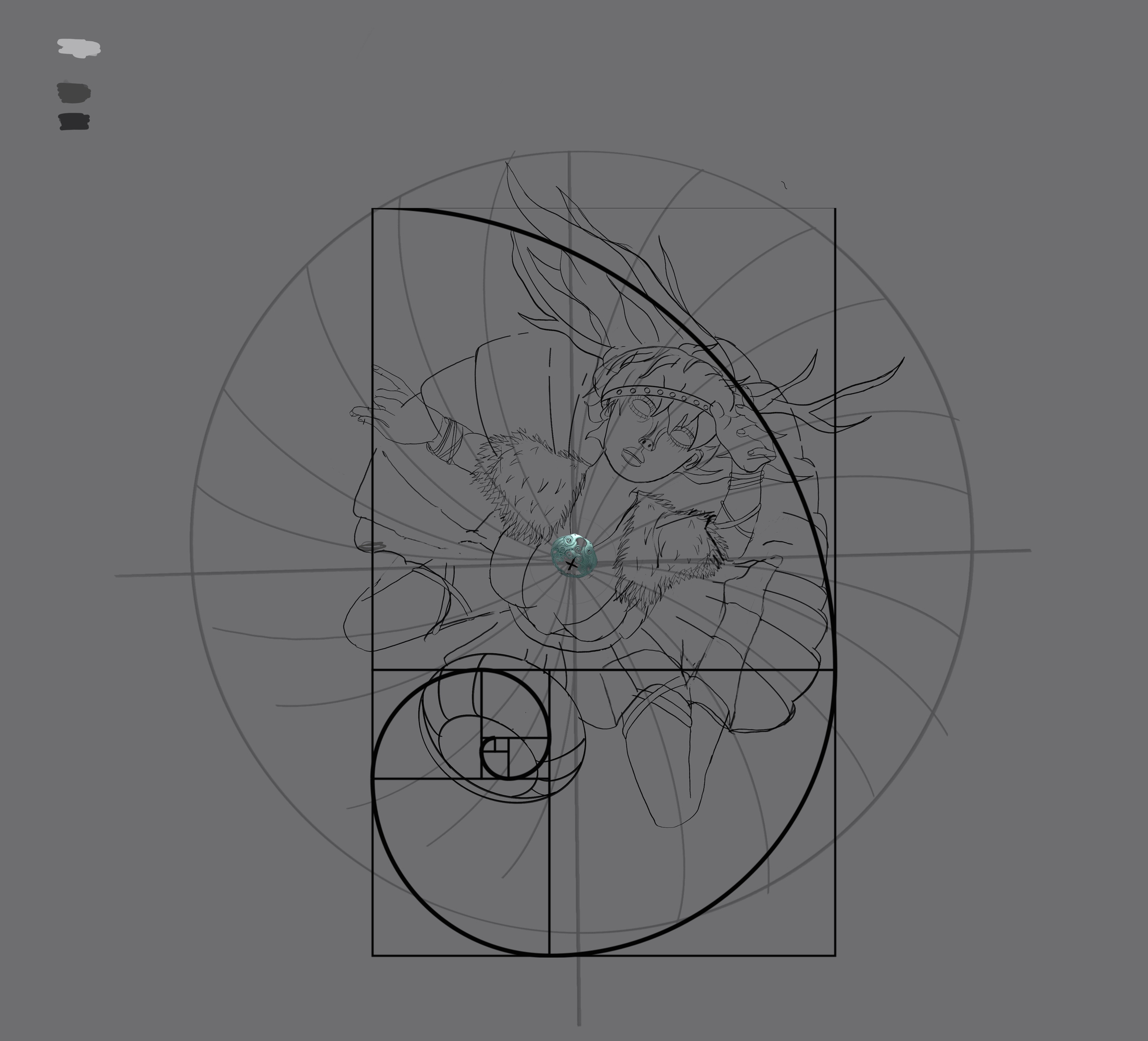 Merci !! Oui je me suis repasser l’interview de Marie Magny du coup et deux trois autres sources mais oui, eux il parte avec une base c’est pour ça que j’ai essayé de respecter le brief mais sans trop chargé. Surtout qu’avec une perspective comme celle là je dois aussi penser à orienter les objets qu’elle porte par exemple mon idée c’était de mettre des éléments de viking fort comme le surmanteau en poil ou les cornes et essayer de la situer dans la mer des Caraïbes à la recherche du trésor et donc avec une robe plus légère. Et je voulais pas trop la sexualiser donc pas de grosse poitrine, déjà qu’elle est cambré… j’étais parti poour faire une robe qui rappelle le coquillage et avec des plis façon mandala qui on pour centre son collier magique qu’elle porte au cou (finalement j’ai fait une correction rapide et au niveau de la perspective de la robe je suis pas très sûre de moi) pour ma recherche de design, ensuite j’ai exporté un mannequin droit de chez magic poser et j’ai repris mes réf à côté et je me suis dit « pourquoi j’ai retenu cette image ? Qu’est-ce qui a retenu mon attention ? » et j’en ai fait un mix en gros des éléments qui me plaisent. La robe par contre pas de réf précise, juste un souvenir d’un truc que j’ai vu une fois parce que je regarde beaucoup beaucoup Pinterest et arstation, je sature mon cerveau d’image de référence et je sais qu’à un moment il me ressort des trucs que j’ai vu… Je vous mets l’évolution -