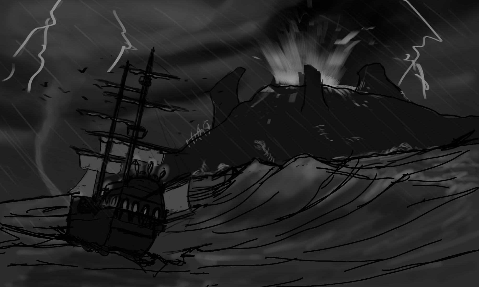 Bonjour à tous. Merci encore pour vos conseils. Y a une bonne ambiance ici 😁. J'ai rectifié le décalage du bateau. Applique la perspective atmosphérique. Grossis un peu le volcan et quelques détails de squelette qui le composent. -