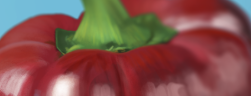 Coucou ! C'est plutôt réussi, j'ai tout de même quelques remarques si tu veux pousser un peu plus loin : Ici le bord est vraiment très net, la séparation avec l'ombre devrait être quasiment perdue : La partie supérieure qui fait face à la lumière je trouve est un peu trop sombre. L'arrière de la tige est trop net également. N'hésites pas à ajouter des ombres sous la tige pour bien séparer de la chaire du poivron pour qu'on comprenne bien, au delà de la différence de couleur que ce sont 2 volumes superposés l'un sur l'autre mais qui restent séparés. Continue comme ca 🙂