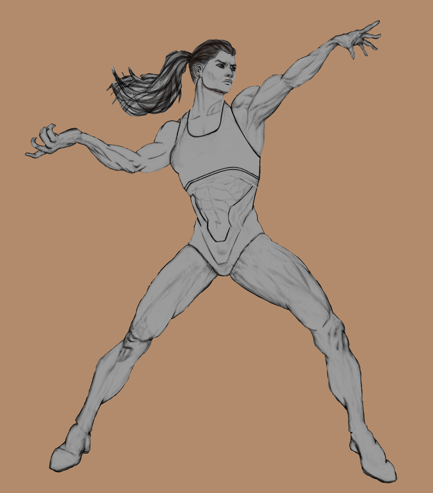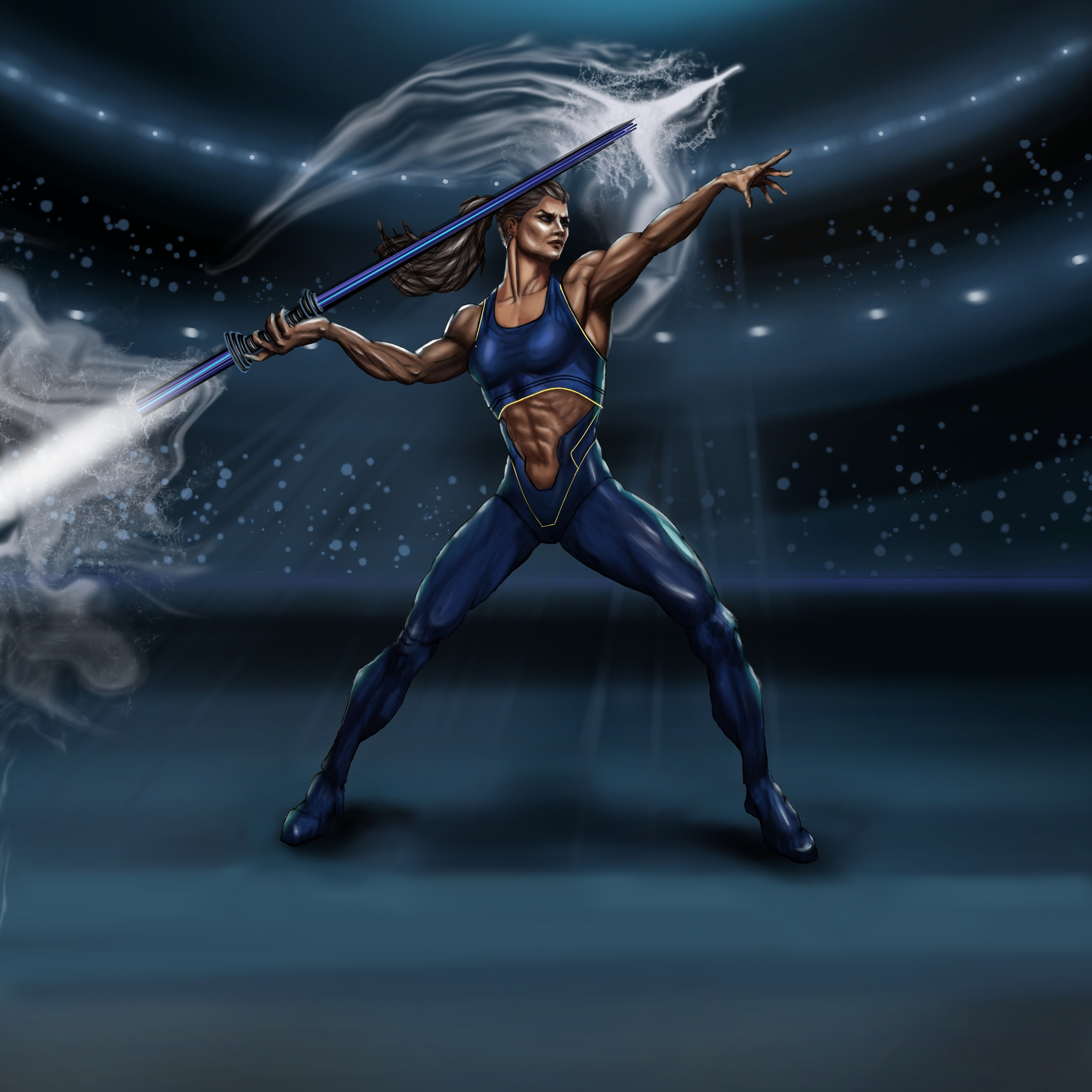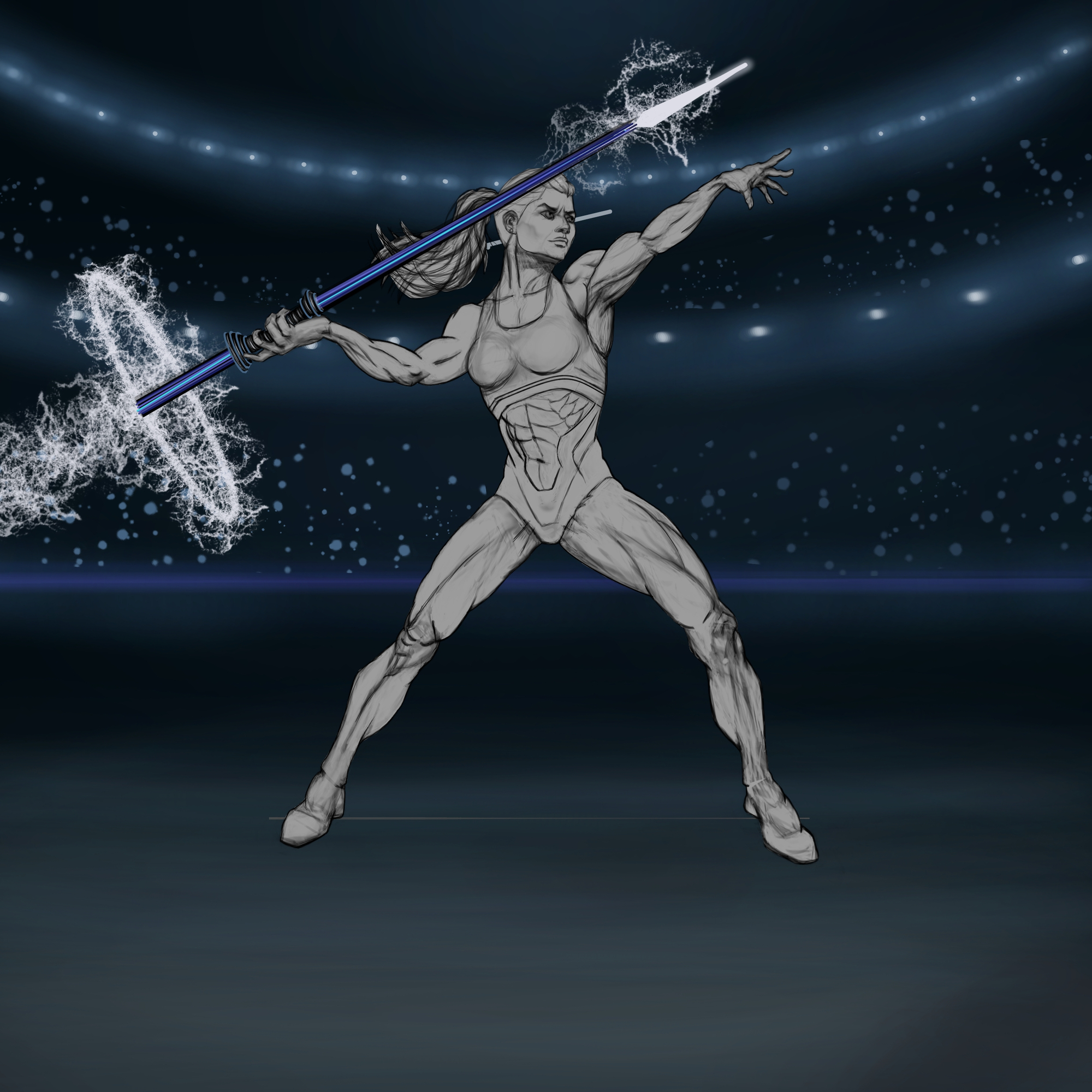 Salut à tous ! Enfin terminé pour ce défi de l'athlète. Ce projet a été pour moi l'occasion de mettre en pratique les acquis du défi de janvier sur l'anatomie, tout en travaillant sur la lisibilité globale d'un personnage. Je vous joins mes étapes de recherche, notamment l'étude en aplats gris et les premiers tests. Passer par ces phases m'a permis de mieux poser les volumes avant de m'attaquer à la couleur. Pour ce sujet, j'ai choisi une athlète maniant une lance de plasma dans une arène nocturne. J'ai voulu jouer sur le contraste entre l'énergie électrique de l'arme et une tenue de sport technique aux tons bleu électrique et doré pour qu'elle se détache bien du décor. Grâce à ce défi du mois, j'ai enfin réussi à oser mettre de la couleur et Krita devient moins secret pour moi. Ça m'a grandement aidé pour enfin entamer par la suite, mes projets d'illustration persos (et sans oublier de realiser celles entamées sur ce mois). C'était un exercice intéressant pour bosser les volumes musculaires sous une source de lumière intense. N'hésitez pas à me donner vos retours sur l'ensemble !