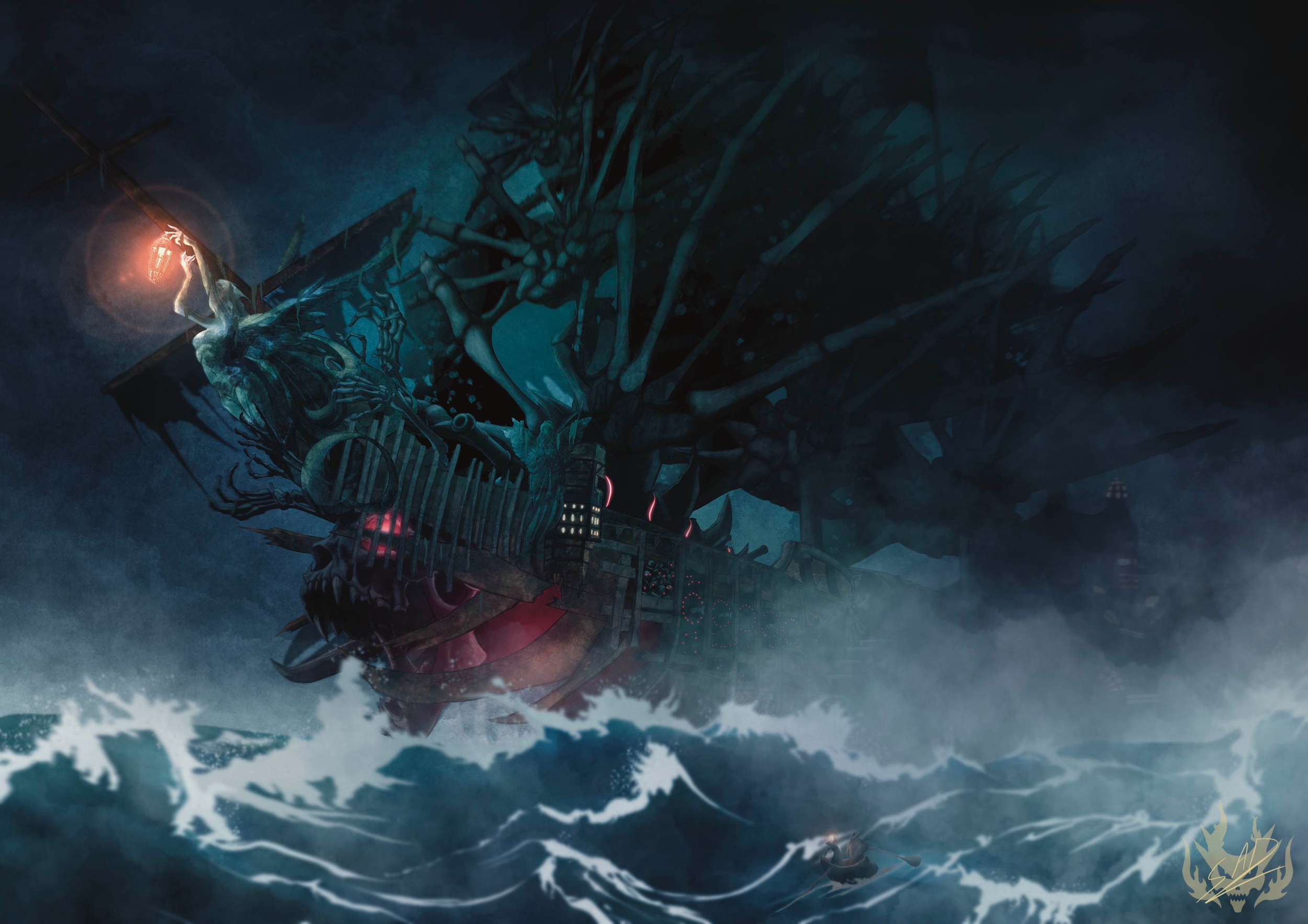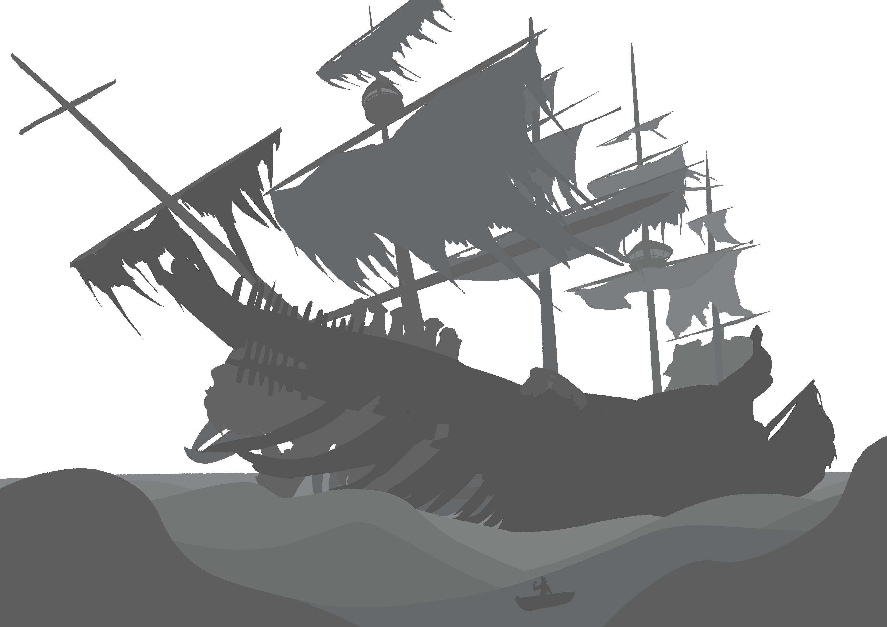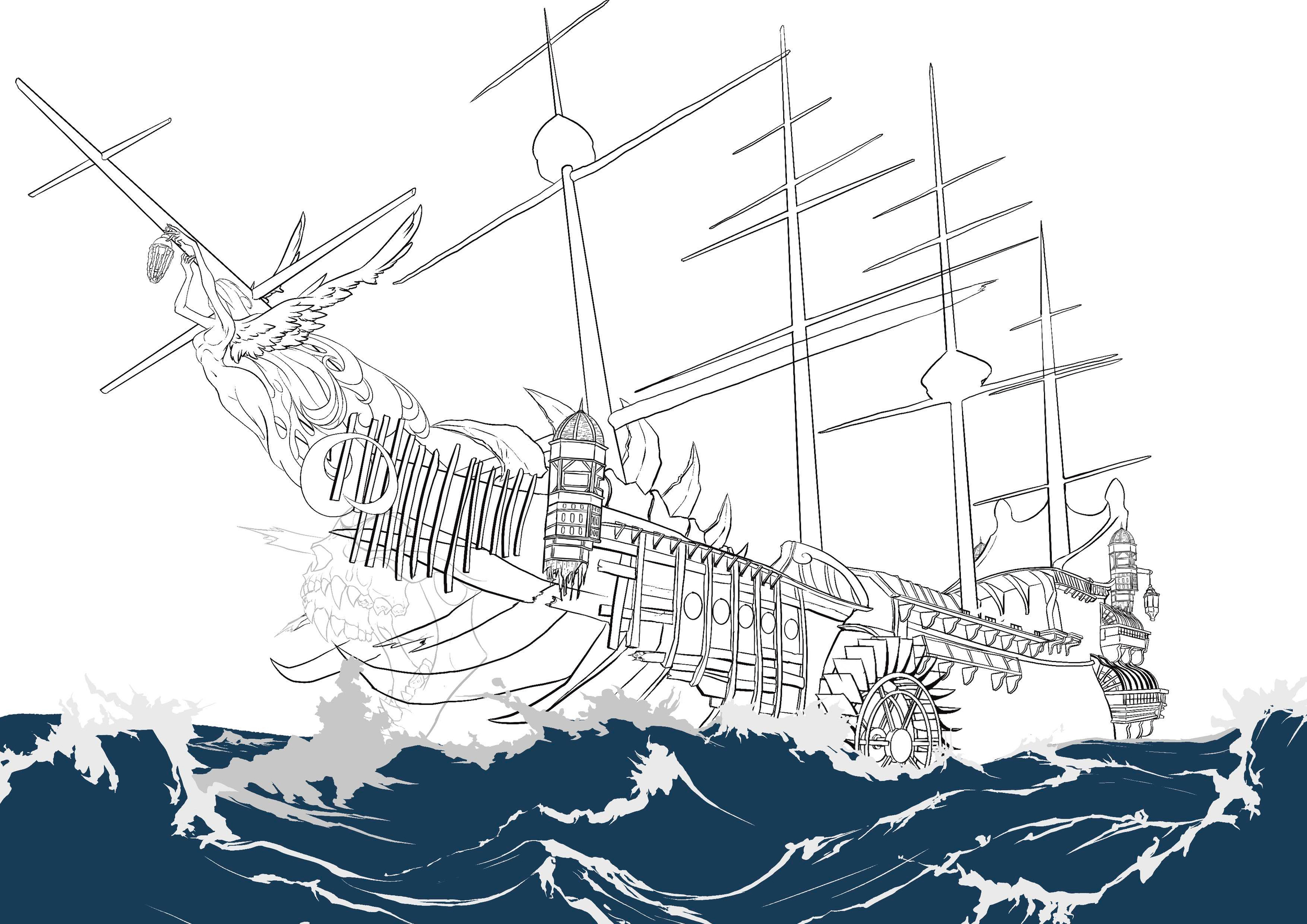 Bonjour à tous ! Voici ma dernière participation à ce challenge. A l'origine j'étais pour faire un pirate des Coeurs Brûlants et un des pirates déchus. Mais un des enviro m'a inspiré. Celui du navire du Capitaine des pirates déchus, de la terreur des mers, le Black Bones. Dans sa description, nous avons un gigantesque navire qui, avant d'être maudit, devait être un des plus beau et des plus grand navire de son époque. Cela ma rappeler le Silent Mary, le navire fantôme du 5ème opus de Pirates des Caraïbes. Un galion gigantesque qui, grâce au pouvoir de Salazar (antagoniste principal) pouvait lui faire changer de forme pour dévorer littéralement ses navires ennemies. Durant la phase de croquis j'ai voulu partir sur un navire unique, tellement grand qu'il s'agirait d'une forteresse mobile à 5 mats. Il serait également équipé d'une paires roues à eau pour l'aider à avancer et gagner en vitesse pour rattraper ses ennemies. J'ai par la suite commencer à rajouter des détails, mais quelque chose me dérangeait... Tout d'abord il y avait la perspective ainsi que la scène que je voulais représenter. A l'origine je voulait faire le navire sortir du brouillard pour que l'immence crâne à l'avant donne un coup de croc à un autre navire. Ce qui aurait donner une idée de la taille colossale du galion. Mais j'avais beau me creuser la tête j'avais trop de question sur la suite de la réalisation...