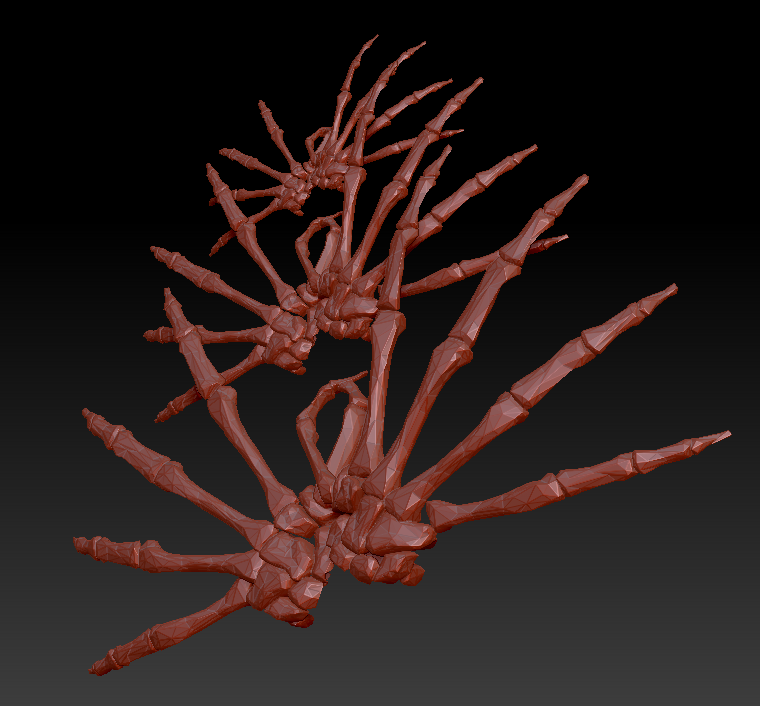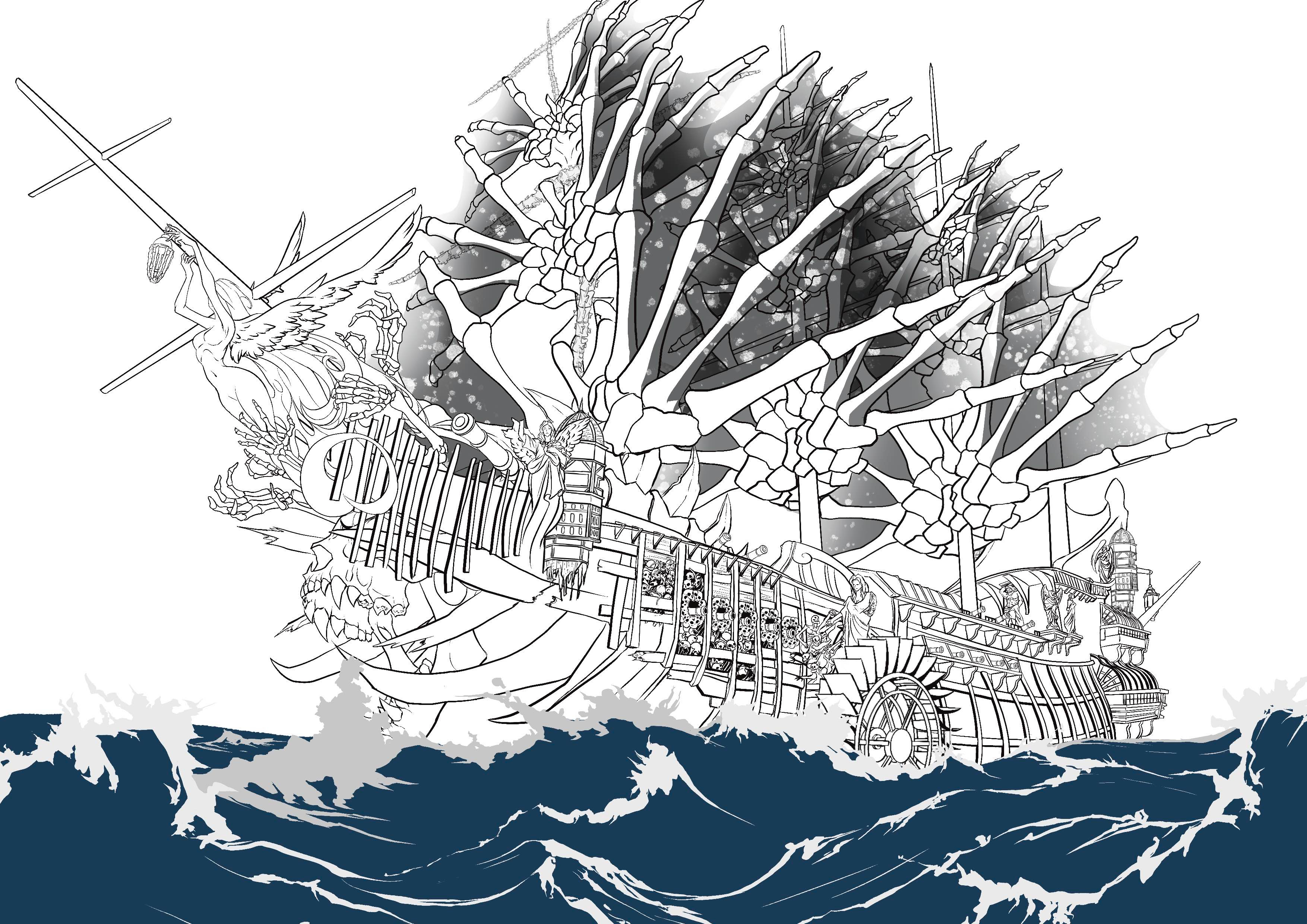 J'ai donc pris la décision de tout recommencer et de changer ma façon de faire. Comme le navire allait dans tout les cas apparaitre avec un brouillard, je suis partie sur des formes en aplat de gris pour distinguer les formes et prendre plus de liberté. Puis j'ai ajouter des détails et commencer à travailler la mer pour me changer un peut les idées. Comme il devait être un navire assez noble et riche à son époque. Je suis partie sur des détails très fournis, même si pour le coup je n'arrivais pas à avoir d'idée pour rendre le côte organique au navire. Il ce nomme le Black Bones mais mise à part le crâne à l'avant il manquait quelque chose... Je suis donc passé sur Zbrush pour modéliser des mains squelettes que je mettrais au niveau des mats. Et comme pour ma participation avec "la Capitaine du Black Bones", j'ai rajouter beaucoup de détails et ce même si je trouvais qu'il y en avais assez. -