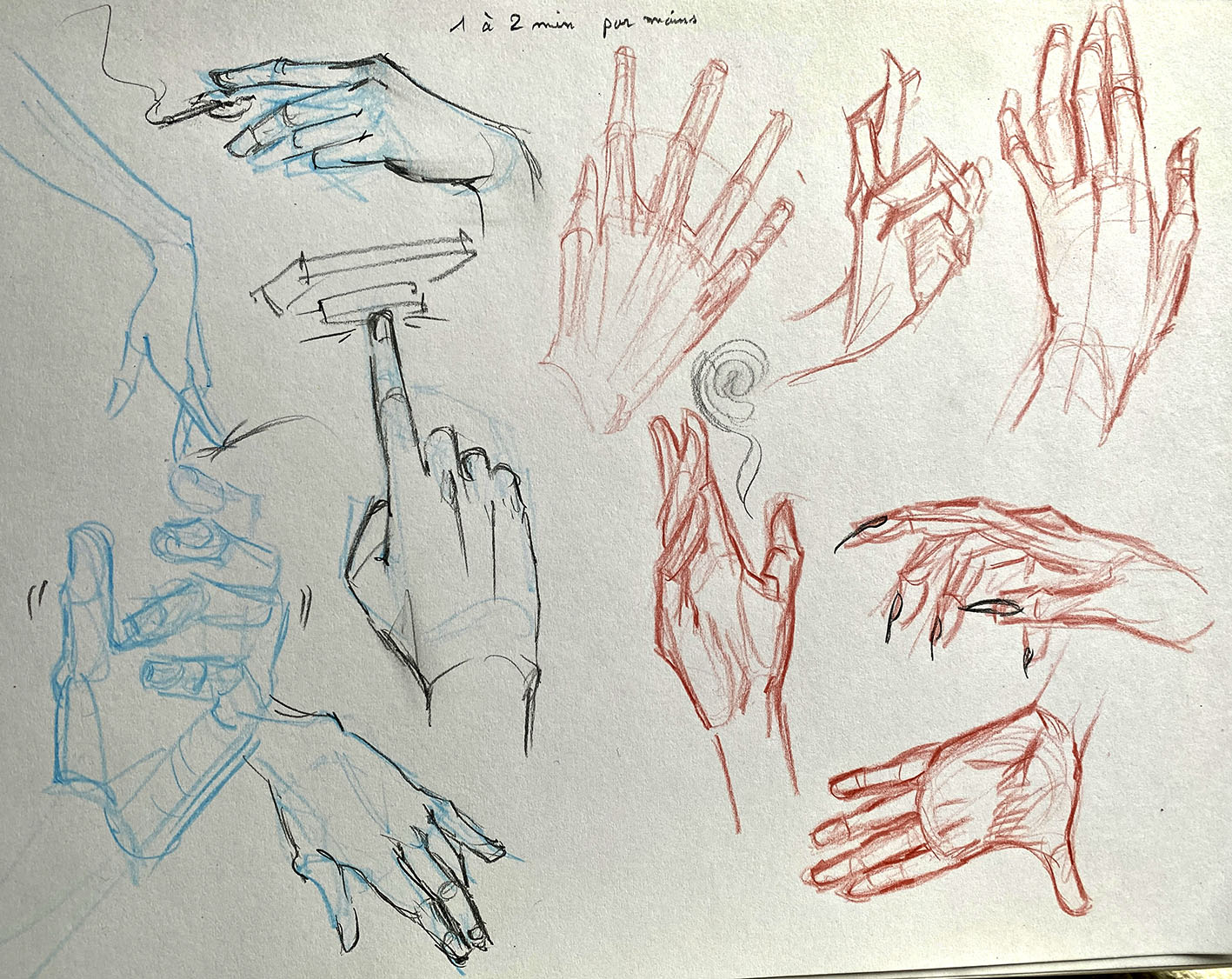 Allez une dernière série pour la route ! 🙂 Voici ce que j'en pense: 1 à 2 min par mains en ne ménageant pas ma cadence, l'exercice ici est de conserver chaque traits, du plus précis au plus incertains, tout est bon à prendre ! Je sur sollicite mon cerveau à capter, ressentir sans trop calculer ni trop analyser ce qu'il perçoit, pas de place pour la justesse du trait. C'est dans le lâcher prise ou l'accident qu'on se créer sa propre patte, plus instinctive ! plus authentique ! On conserve l'énergie de la pose, son émotion première 😉 Avec du gros son ca motive ! -