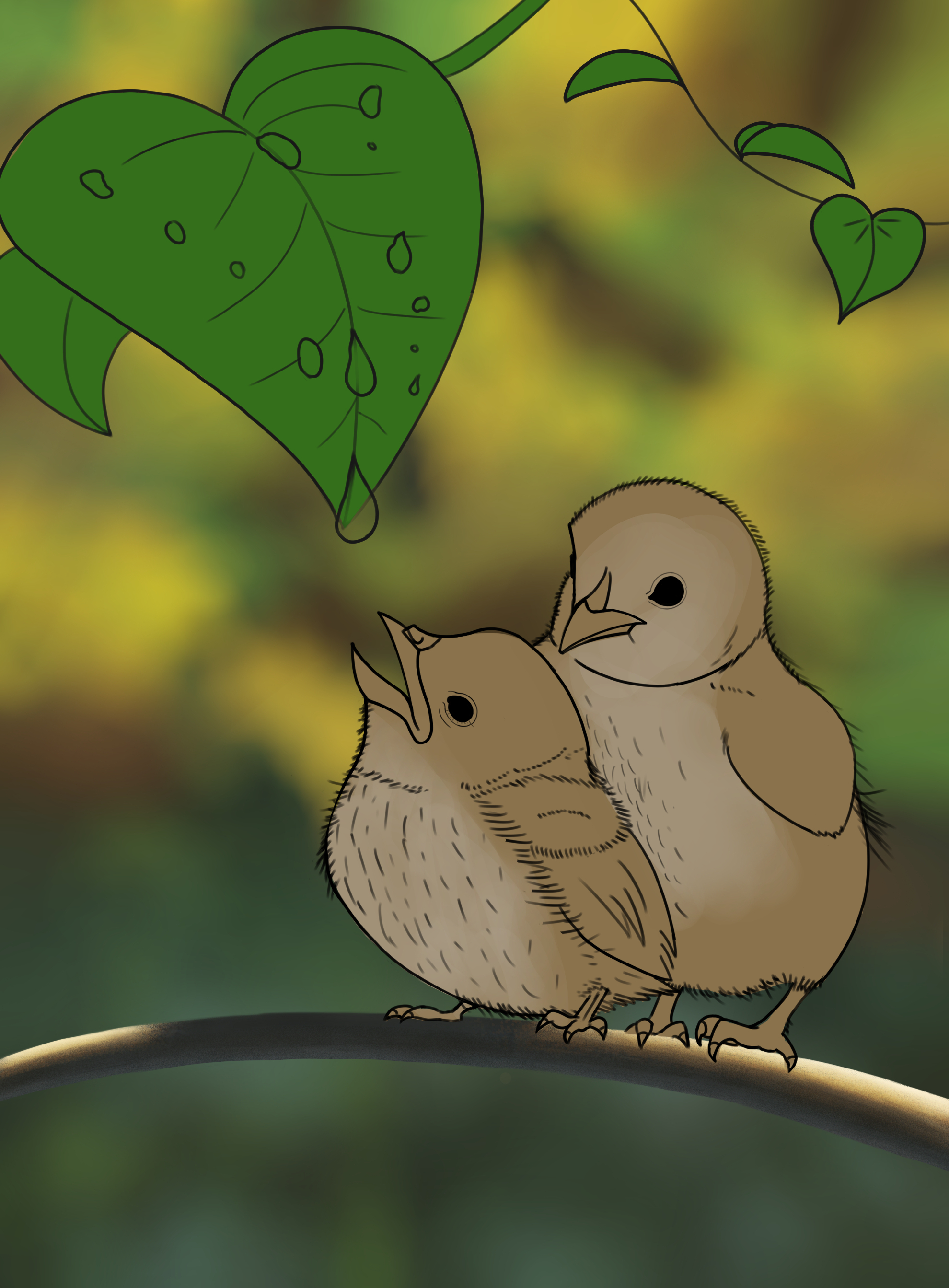 Exercice 6 - Les oisillons Passage à l'exercice 6, je suis plutôt content de moi pour une fois, même si bon avec une vidéo pas à pas, c'est forcément plus simple ^^' En tout cas, n'hésitez pas à me faire des retours sur mon croquis, si ça peut améliorer mon illustration ou moi, je prends avec plaisir !