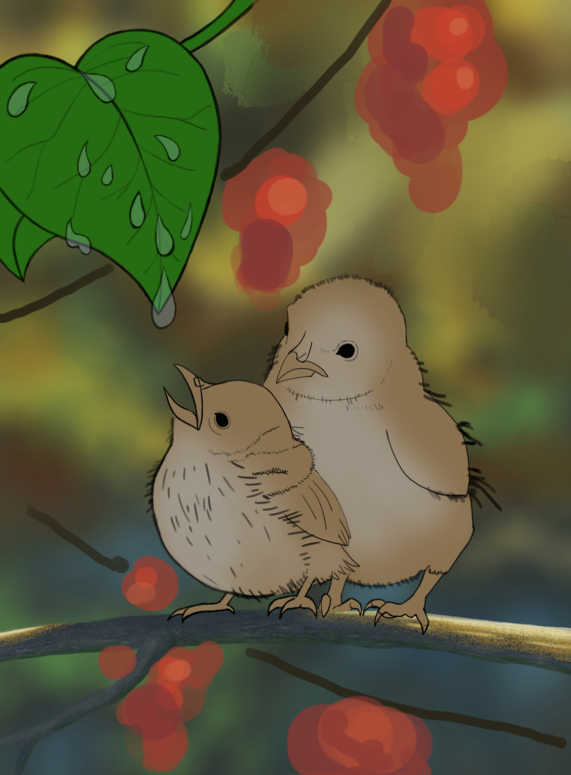 Bien sûr @Arka, se documenter et rassembler dans un moodboard les références qui te plaisent c'est essentiel pour développer son style 😉 L'ajout des baies est ok mais c'est le rouge qui parasite l'image, il est tellement vif qu'on ne voit plus que ça, n'oublie pas que lorsque tu ajoutes quelque chose sur une image, elle doit servir la composition. Si tu veux vraiment en ajouter, il faut qu'elles soient placées de sorte à que l'oeil se dirige vers les oisillons, chez toi tu guides l'oeil vers l'extérieur de l'image. C'est normal quand on débute de pas pouvoir se lancer sur des grands projets, un conseil c'est d'utiliser ces exos pour développer ton univers. Si tu fais une étude de visage, profites en pour faire le visage de ton perso par exemple 😉 Bon courage !