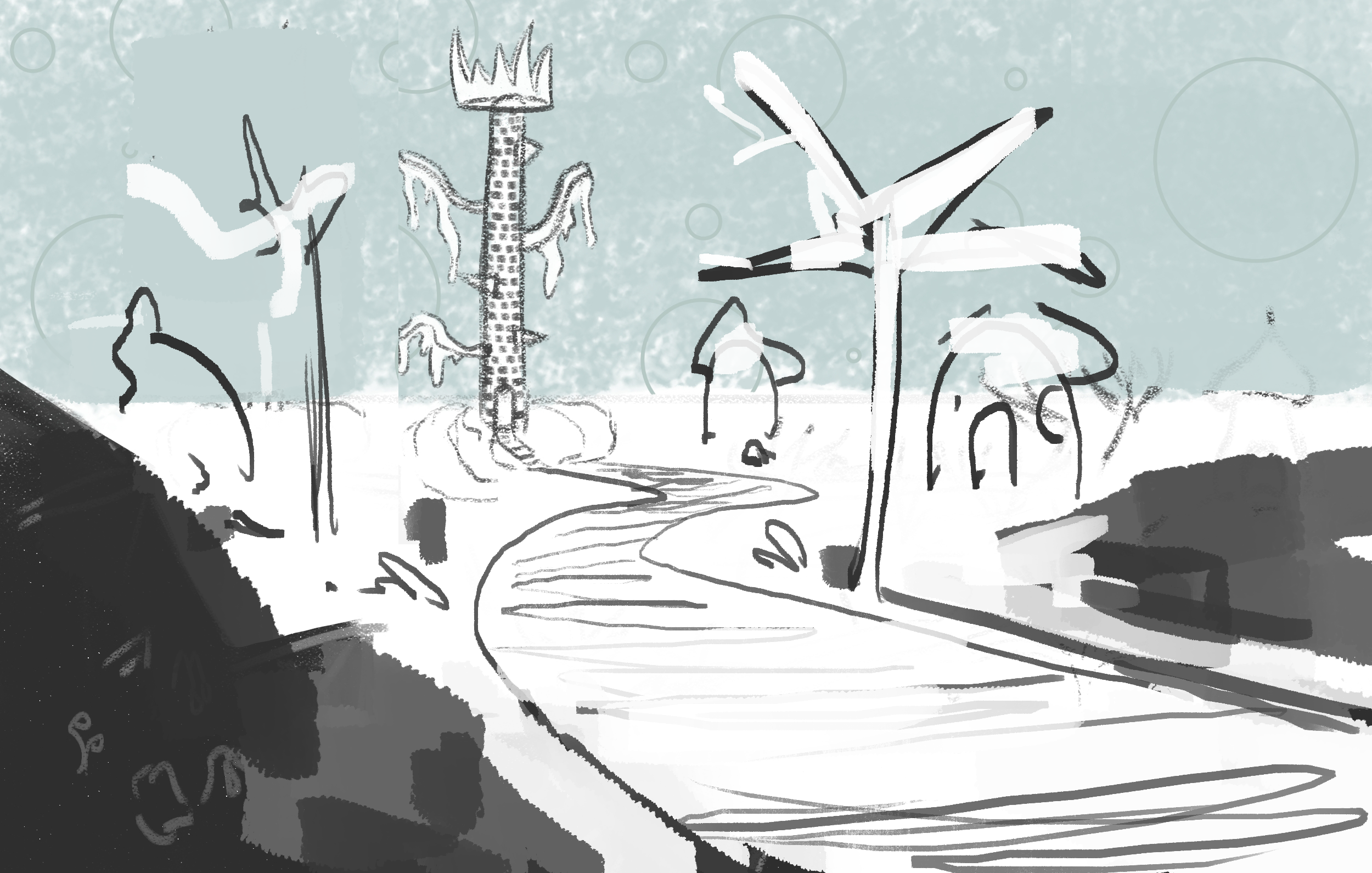 Coucou @Dark Romantica, en fait tu as un chemin qui serpente vers le centre de l'image puis qui vire d'un coup tout à gauche pour aucunes raisons 😄 Tu as aussi une maisons isolée tout à droite sans trop qu'on sache pourquoi. Lorsque tu fais une composition, tu dois donner du sens à ton intention, "un chemin qui mène vers une tour" tout doit convenir à cette idée. Ajoute de la perspective au chemin pour qu'il guide réellement vers la tour. Place des maisons sur le chemin pour guider le regard.