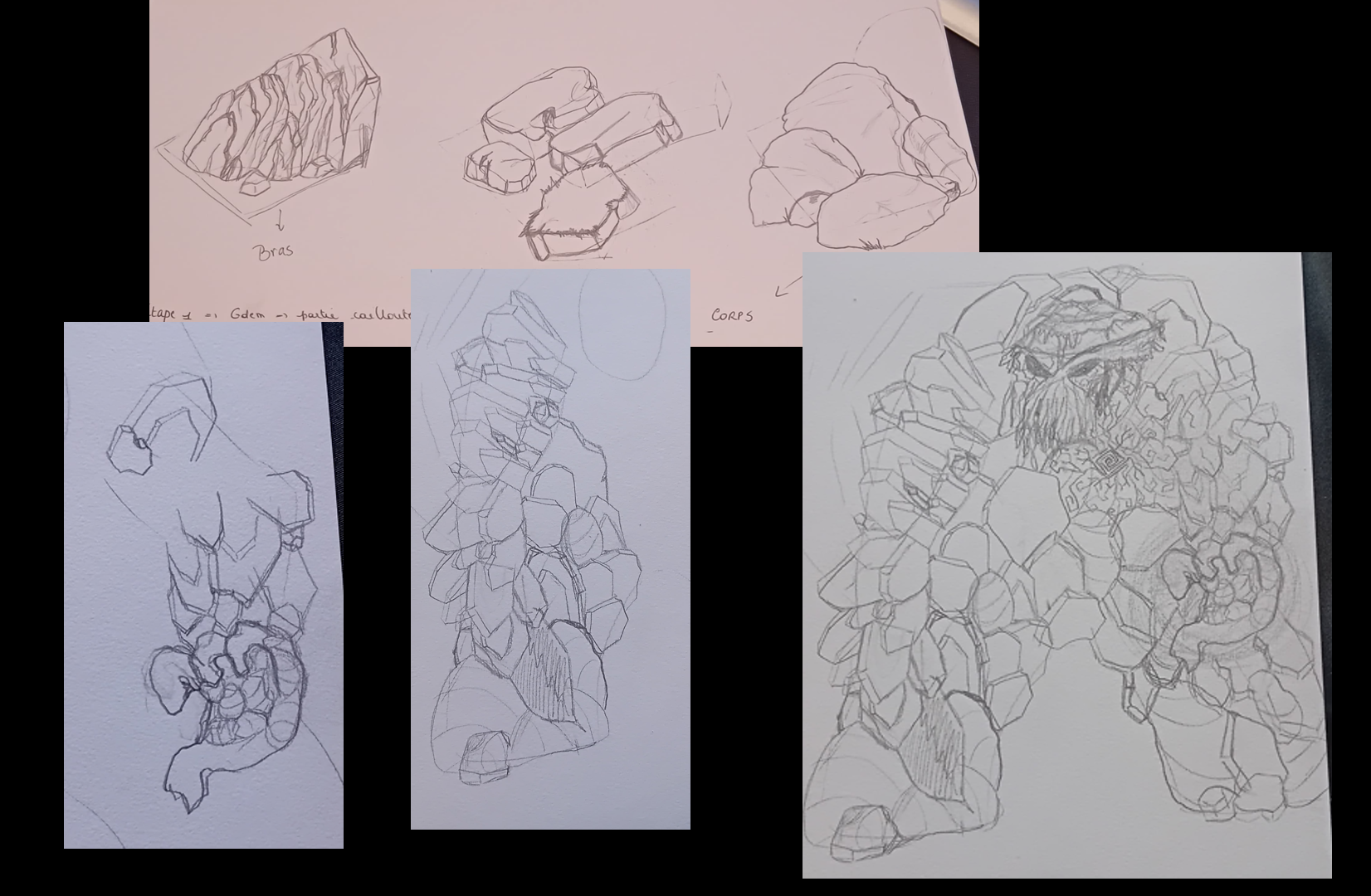 11. Inspirations pour la recherche de la tête du golem Voilà quelques croquis réalisés lors de la recherche du design de la tête du golem : Ils ont tous un petit quelque chose, maais, je suis à moitié convaincue à ce stade. Je souaitais avoir le côté marécageux qui ressorte sur la tête et tenter de faire apparaitre un semblant de forme de chapeau pirate pour Sakado, maais de façon naturelle.... J'ai finalement chipoté avec les différentes caractéristiques pour faire une nouvelle tête, ajouter de l'asymétrie et un côté plus difforme à la tête du golem (car ça reste un amas de pierres, qui plus est sous des algues et de la boue, pour le côté marécageux) ainsi que les petits éléments qui me manquaient encore pour trouver un semblant de forme dans l'amas de pierres et algues. Au final, cela m'a mené à la tête finale :