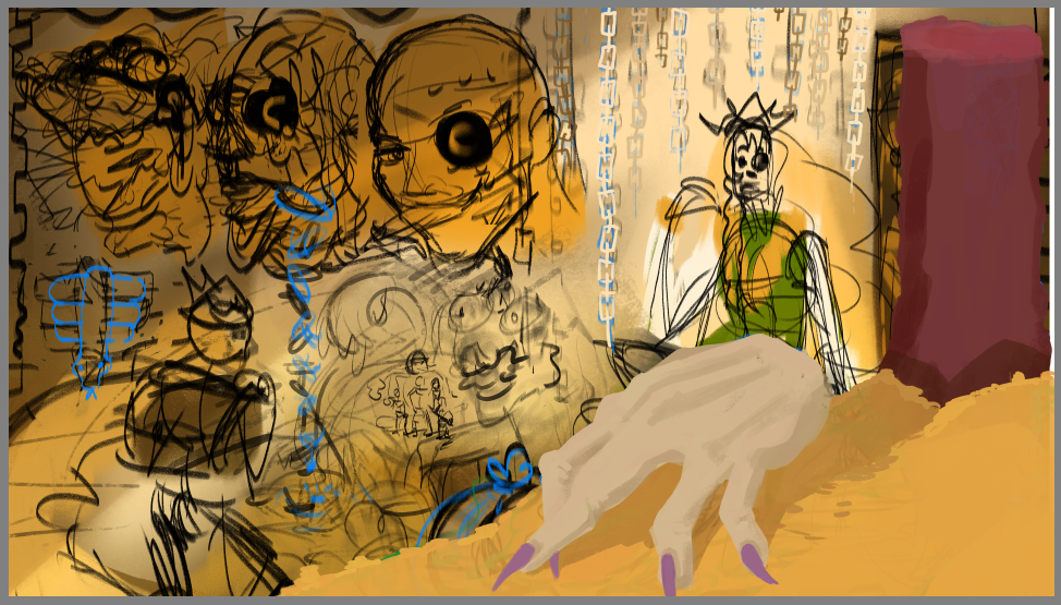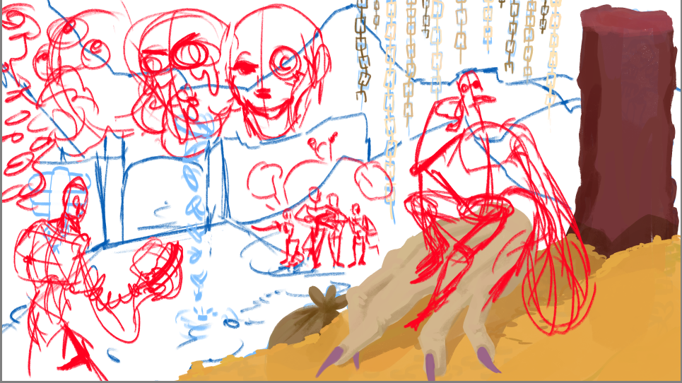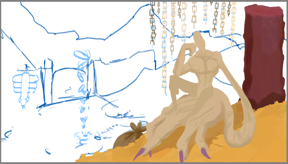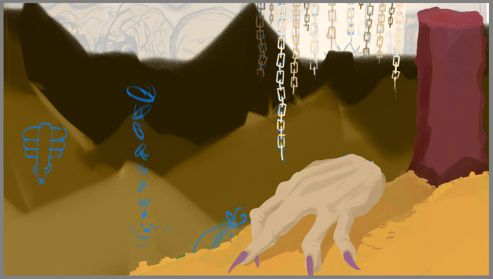 6. Pour le sac à dos, j'ai cherché plusieurs designs ! Je n'ai pas de photo de mes brouillons de sacs. Mais je voulais donner un aspect naturel, qu'il ait pu tirer ce sac de son environnement. Mais sans que ce soit un gros cailloux, pour qu'on puisse différencier le sac du golem. J'ai tenté une sorte de grande urne en argile attachée dans son dos. Avant de finalement opter pour un sac en forme de coquille (ressemblant un peu à celle de coquillages à points ou des coquilles de bernard l'hermite mais vu de face et sans la pointe). Menant à l'allure de la coquille finale