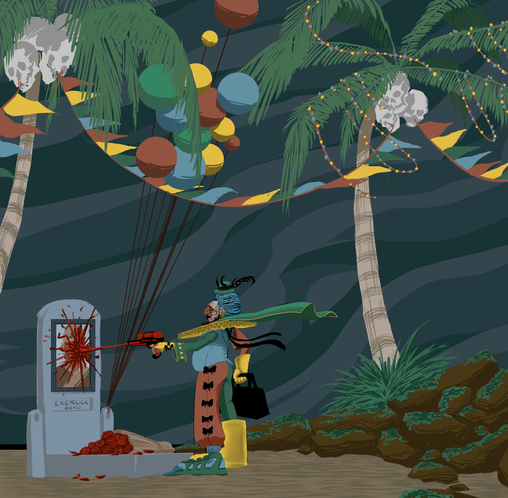Bonjour à toutes et à tous ! Ravi de rejoindre la formation et hâte d'échanger avec beaucoup de monde. Un grand merci Spartan pour les vidéos très détaillées dédiées à Krita ! Elles m'ont permis de redécouvrir le logiciel et donné envie de prendre du temps sur cet exercice zéro pour commencer à adopter de bons réflexes : raccourcis, utilisation des types de calques et de masques, alterner entre dessin libre et stabilisé, etc. Un brush plume a été utilisé pour la quasi totalité de l'image, mais j'ai cassé la cohérence à certains endroits pour tester un brush mouillé sur le gant et la botte et un brush de motif sur le sable. Le reste est un festival de soucis (autant de défis à surmonter !) : crânes trop gros, composition dans un format quasi carré avec un vide à droite (peut-être qu'en mettant plus de rochers dans cette partie et en ajoutant un objet ou un animal en train de regarder le clown, ç'aurait pu être mieux), perspective et profondeur perfectibles, manque de références sur lesquelles s'appuyer, attention sans doute trop attirée par le haut de l'image, contours approximatifs des formes, tracés de croquis apparents par endroits, certaines couleurs inadaptées à l'ambiance nocturne... et d'autres choses difficiles à formuler ou qui m'échappent. Au niveau pratique : même en groupant et en nommant chaque calque, dès qu'il y en a beaucoup, dérouler la liste des calques est long et je me retrouve à... créer un nouveau calque pour repeindre par-dessus ce qu'il faut corriger. Est-ce qu'il existe un outil qui permette de retrouver les calques facilement en cliquant sur une zone de l'image ou un autre moyen ?