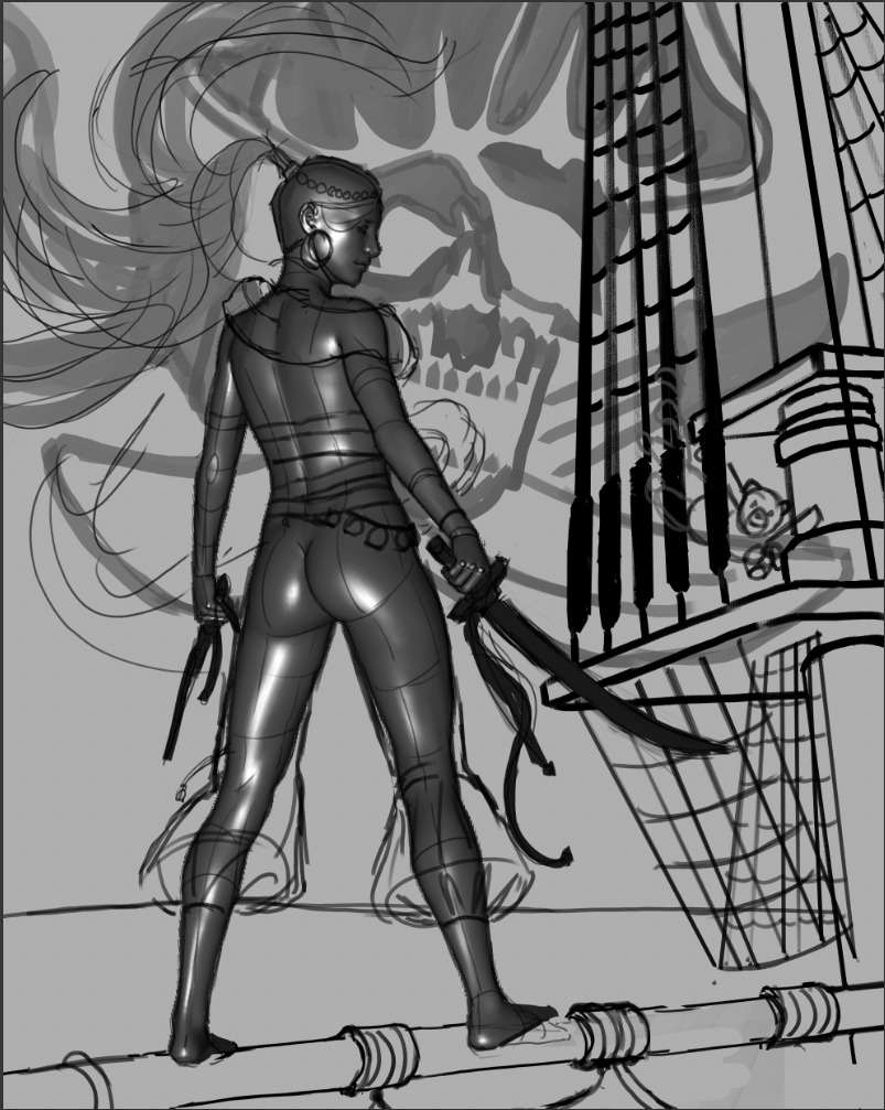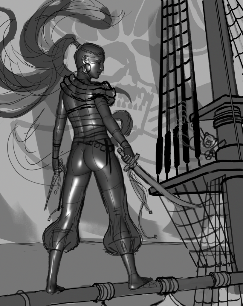 recoucou 🙂 j'avance sur la compo de mon loooooooooong nez ! aussi petit dessin sur le pirate qui siffle pour contrôler des ORCS ! (et non des orques de la mer). -