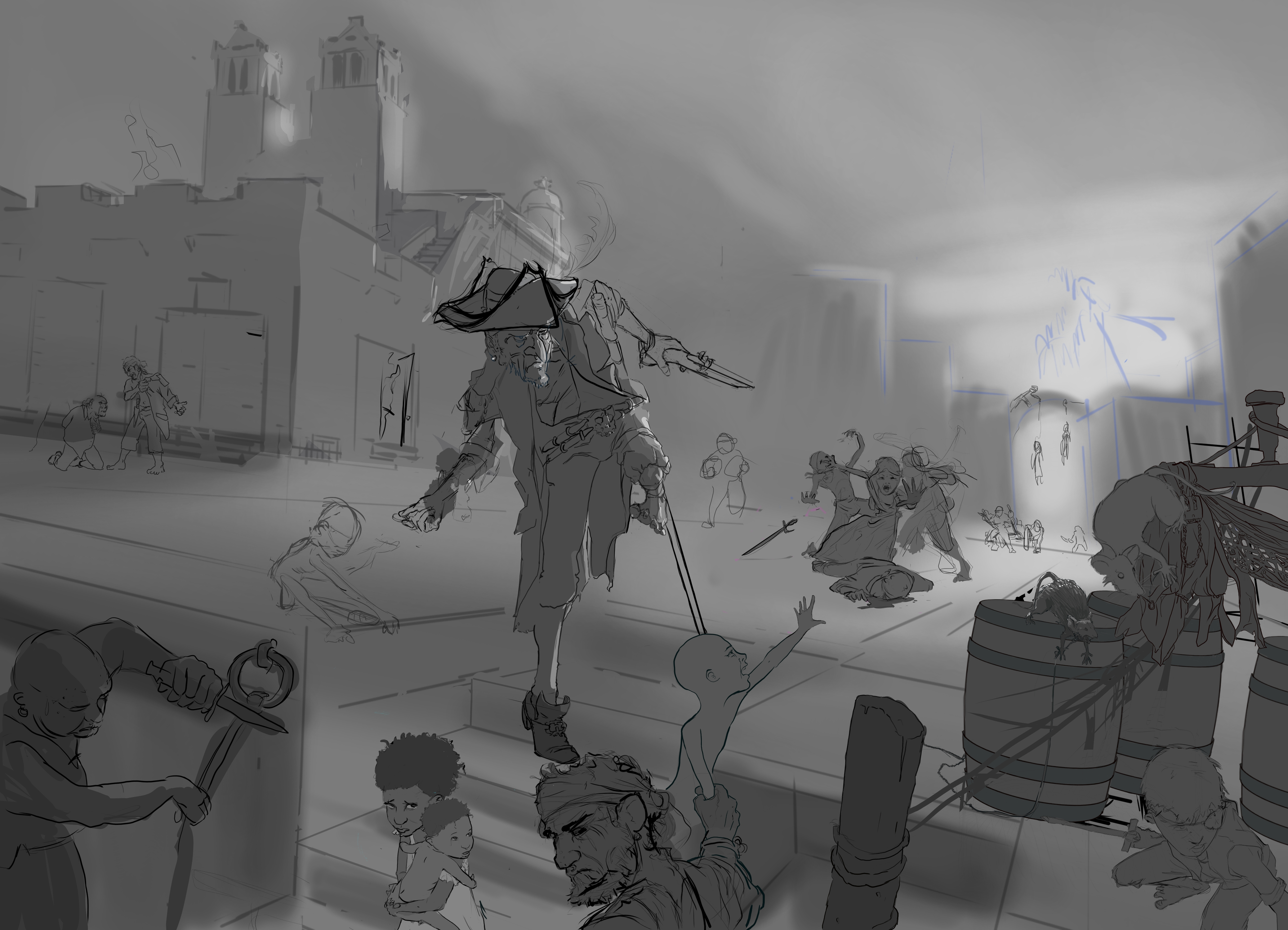 Yes tu as pas tort, et c'est justement pour ça que "certains témoignent de silhouettes de spectres encapées" J'ai plus en tête les termes exactes du brief mais à un moment ils parlent de spectres autour du vaisseau et dans mon histoire ce sont les mobulas qui, avec la déformation de la longue vue, sont pris pour des spectres. J'avais fais un premier test de colo pour ces dernières mais je pense qu'il va pas mal évoluer notamment pour rendre l'adaptation au brief le plus crédible possible 🙂