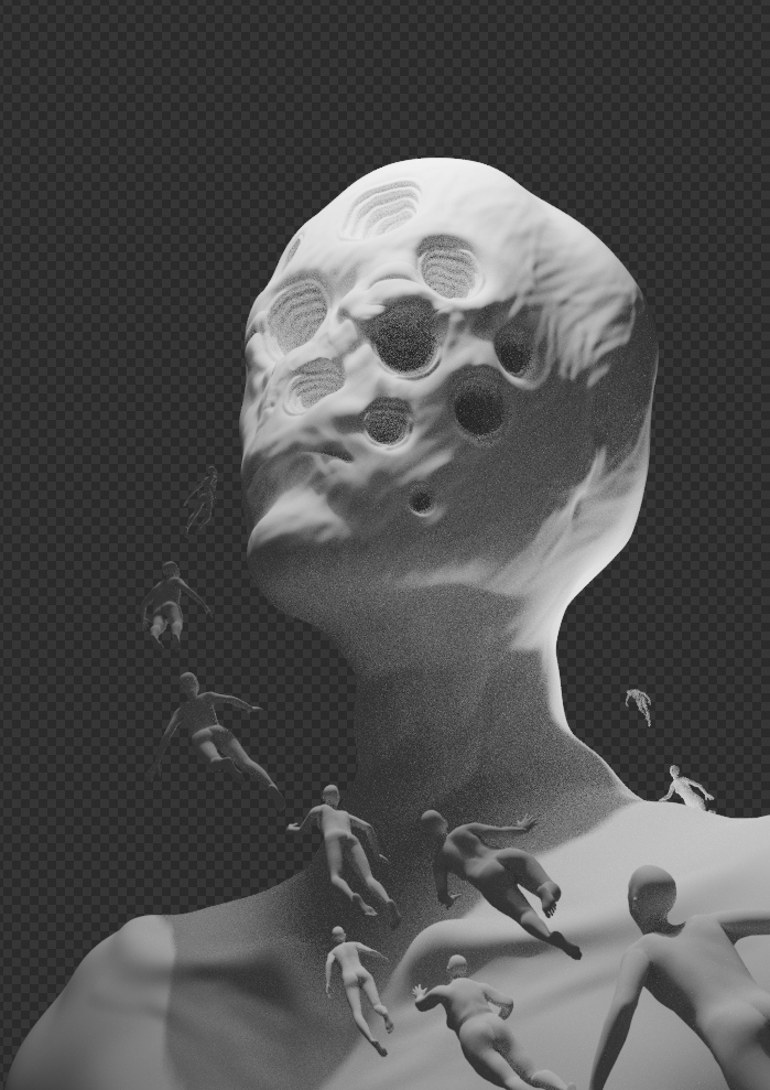 3. Je n'ai pas retouché à la 3D précédente, j'ai fait plein de concepts 3D pas fini pour plus tard, et je pense que j'ai fini ce croquis 3D, si vous trouver qu'il n'a pas de problèmes. J'avais testé sur une sphère la texture de trous présents sur la tête. Ensuite je voulais tester les trous sur une tête et faire que le buste. Parce que c'est simple, comme on peut faire un humain avec MPFB. J'ai aussi fait d'autres textures sur le buste, et j'ai changé la silhouette pour qu'elle ne soit plus générique. Pour ne pas que ça ressemble juste à un test, j'ai ajouté des persos, pour qu'il y ait une histoire. Laquelle ? Je ne sais pas, mais c'est glauque. Moi, ça me fait penser à la santé mentale. Sans analyser plus.