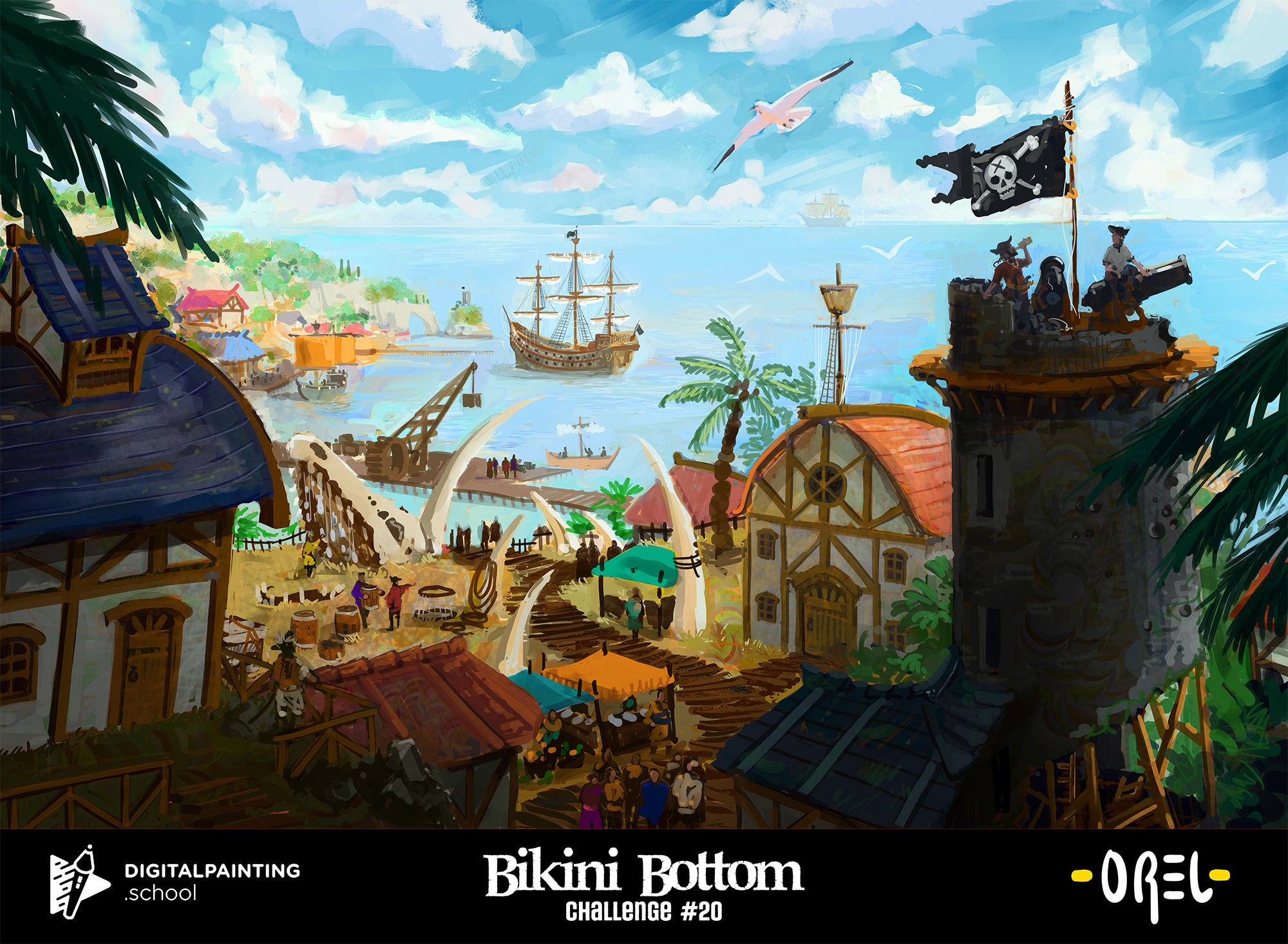 Bonjour à tous ! Voici ma dernière participation à ce challenge. A l'origine j'étais pour faire un pirate des Coeurs Brûlants et un des pirates déchus. Mais un des enviro m'a inspiré. Celui du navire du Capitaine des pirates déchus, de la terreur des mers, le Black Bones. Dans sa description, nous avons un gigantesque navire qui, avant d'être maudit, devait être un des plus beau et des plus grand navire de son époque. Cela ma rappeler le Silent Mary, le navire fantôme du 5ème opus de Pirates des Caraïbes. Un galion gigantesque qui, grâce au pouvoir de Salazar (antagoniste principal) pouvait lui faire changer de forme pour dévorer littéralement ses navires ennemies. Durant la phase de croquis j'ai voulu partir sur un navire unique, tellement grand qu'il s'agirait d'une forteresse mobile à 5 mats. Il serait également équipé d'une paires roues à eau pour l'aider à avancer et gagner en vitesse pour rattraper ses ennemies. J'ai par la suite commencer à rajouter des détails, mais quelque chose me dérangeait... Tout d'abord il y avait la perspective ainsi que la scène que je voulais représenter. A l'origine je voulait faire le navire sortir du brouillard pour que l'immence crâne à l'avant donne un coup de croc à un autre navire. Ce qui aurait donner une idée de la taille colossale du galion. Mais j'avais beau me creuser la tête j'avais trop de question sur la suite de la réalisation...
