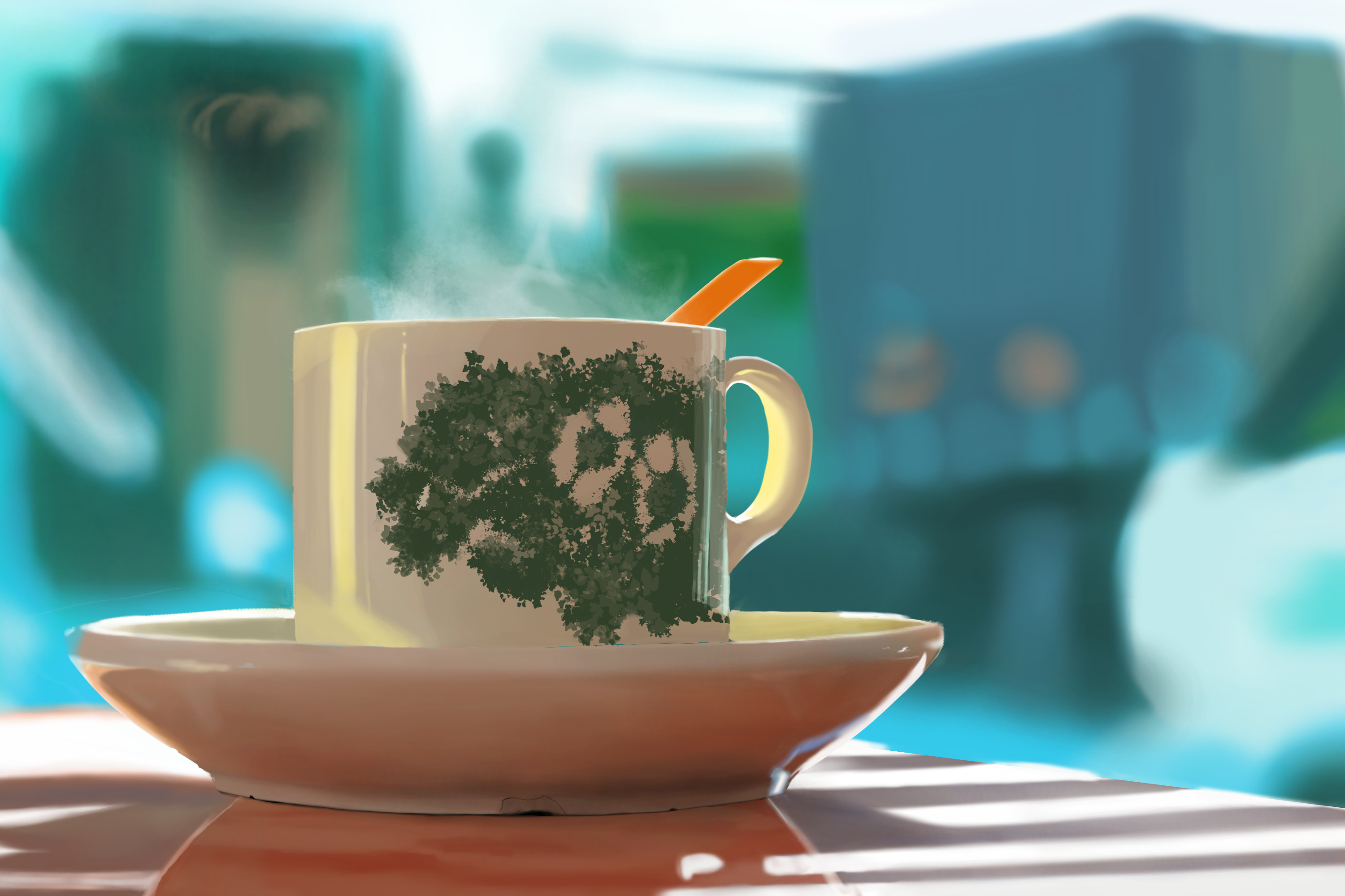 Bonjour, Alors voila, j'ais reproduit la photo de la tasse comme demandé pour l'exercice. j'ai encore essayer de faire sans le croquis au début mais je me suis finalement aidé de celui ci à la fin, de même pour les couleurs où j'ai repris les couleur de l'image de base pour essayer d'avoir les bonnes couleurs de la table . -