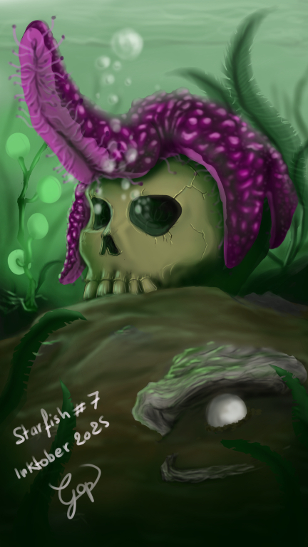 Bonjour tout le monde ! @Shelter Très chouette ton étoile géante et la perspective fonctionne je trouve 🙂 @June Très mignon et très sympa comme modèle pour les ongles. Ça rend très bien avec l'esprit de détente. Pour ma part, voici ma participation. Si le cerf a été épargné de la corruption, ce ne sera pas le cas de l'étoile de mer. Je vous présente une nouvelle espèce découverte cette année : la stella manus diaboli, avec des pics sombres, des yeux rouges pour voir sur 360° et des pitites patounes ressemblant à des doigts humains. Ne la mettez pas sur votre main, elle vous collera et la dévorera à petit feu 😁. Inspiré des monstres de Monster Hunter Wild et des mimics de Dark Souls.