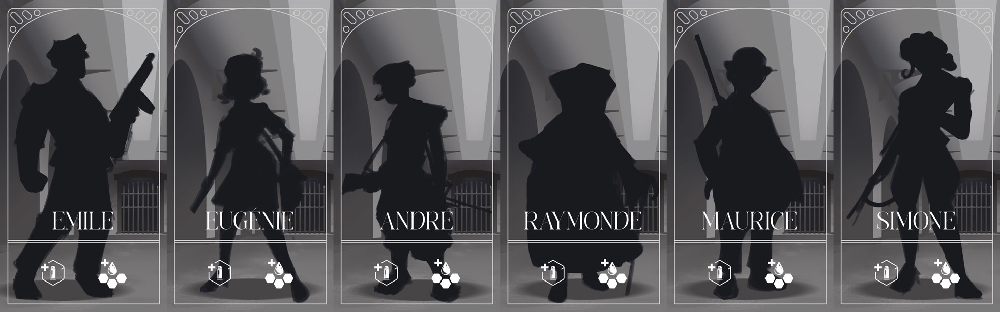 Voici les silhouettes +/- définitive de mes personnages "Matons". L'idée est de créer une équipe un peu hétéroclite avec un seul gardien mais un homme à tout faire, une secrétaire, une nonne, le directeur de la prison et sa femme. Je trouve que c'est plus intéressant visuellement parlant et ça colle avec l'ambiance un peu burlesque et l'idée que toute la prison s'y met. -