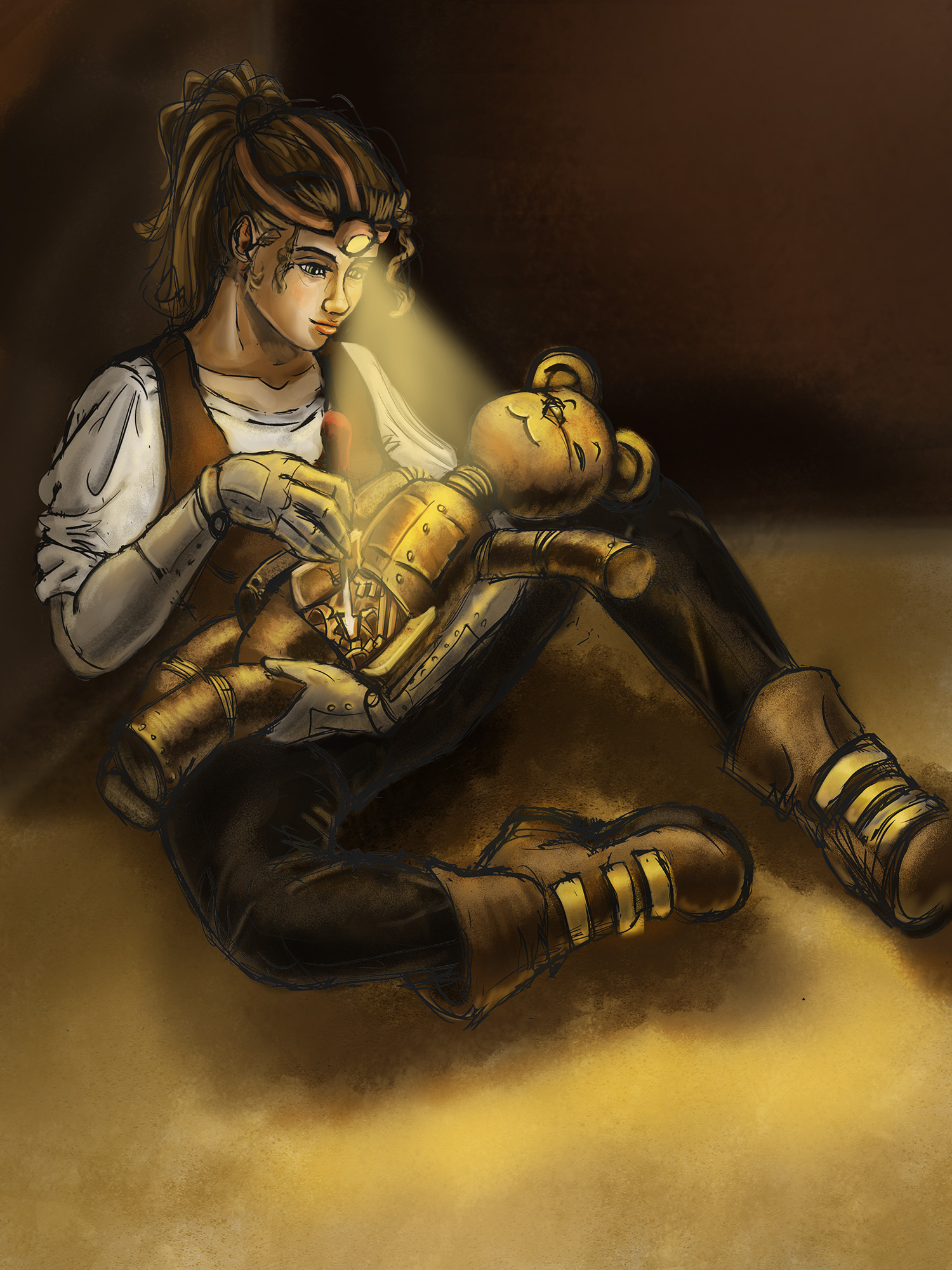 hello chapi, merci d'avoir pris le temps de faire un retour détaillé ! j'ai appliqué les feedbacks que tu m'as donné, pour l'épée du coup j'imaginais qu'elle flottait devant le perso (je voyais plus ça comme un symbole pour suggérer une histoire). Sinon du coup j'ai réfléchi à mon intention et clairement je voulais pas raconter une histoire précise, mais plus faire ressentir une émotion et suggérer un peu d'histoire avec les symbole sur le perso, l'épée etc... j'ai aussi modif la couleurs du fond pour enlever l'aspect un peu "dramatique" que le rouge donnait comme c'était pas l'émotion que je voulais donner. Aussi pour l'exo du dp perso, je pensais faire un speedpaint par chapitre plutôt que de faire un seule dp pendant 7 chapitre, ça me parait mieux niveau apprentissage après a voir si c'est une bonne idée de faire comme ça. Sinon j'ai aussi appliqué le retour que tu m'as donné pour le robot 🙂 -