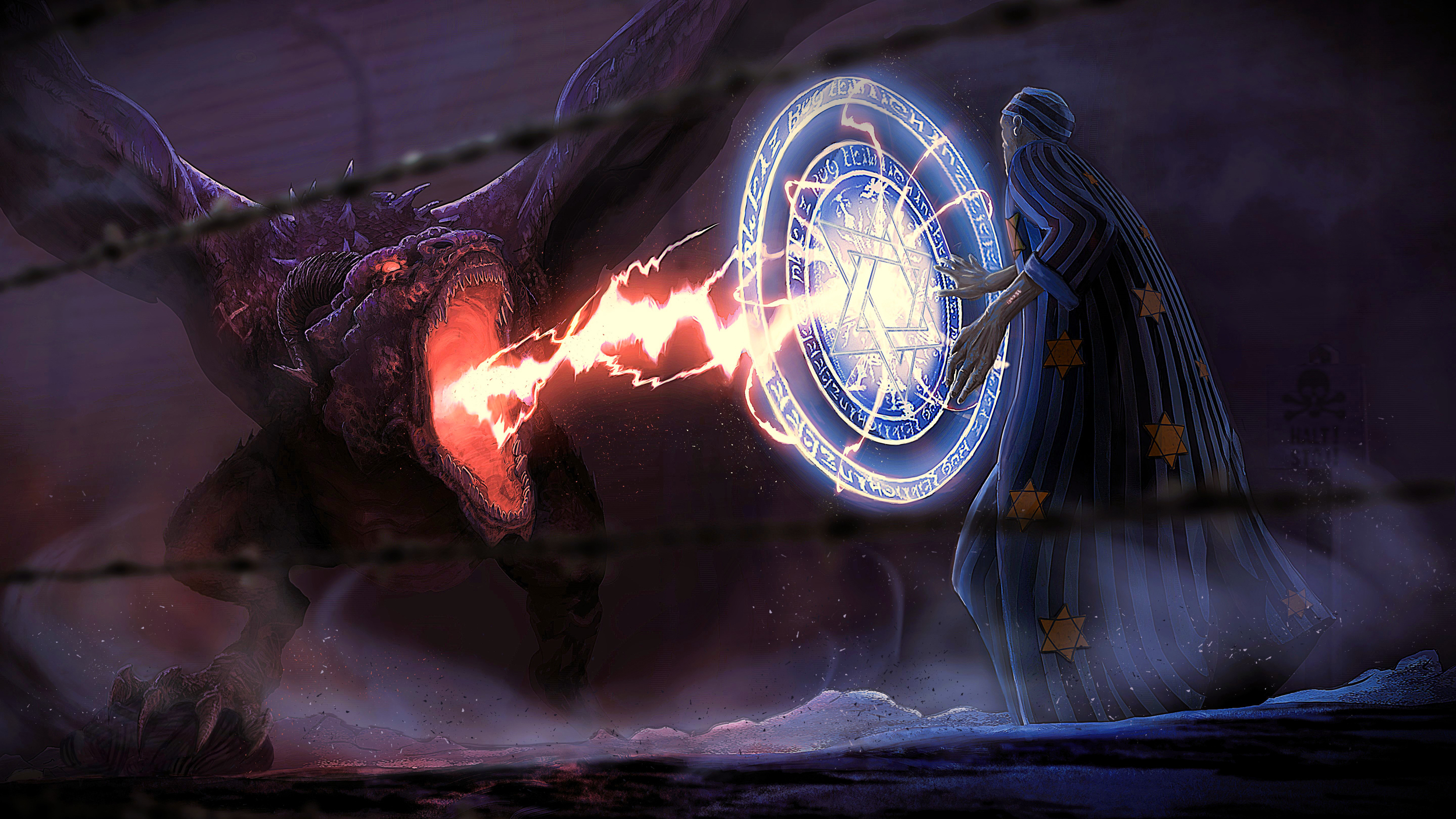 Enfin terminé, j'ai saturé un peu l'image (merci pour ton conseil ZELENTHIR) et mis une cicatrice en forme de croix gammée sur l'épaule du dragon, cela me semble discret et compréhensible. -