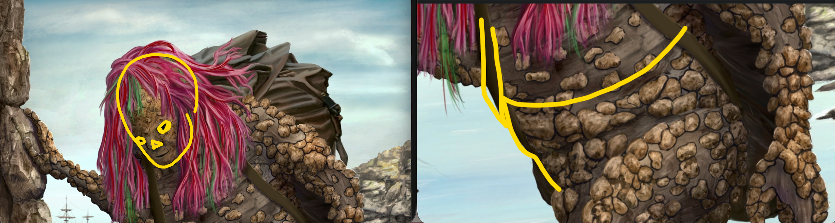 Cool cette nouvelle pose. Attention a la forme de ton crâne et de la position des cheveux. C'est peut-être voulu car ça reste un "monstre" mais ça fait un peu bizarre 😅 Et concernant la bretelle droite du sac, je pense qu'elle descend trop bas.