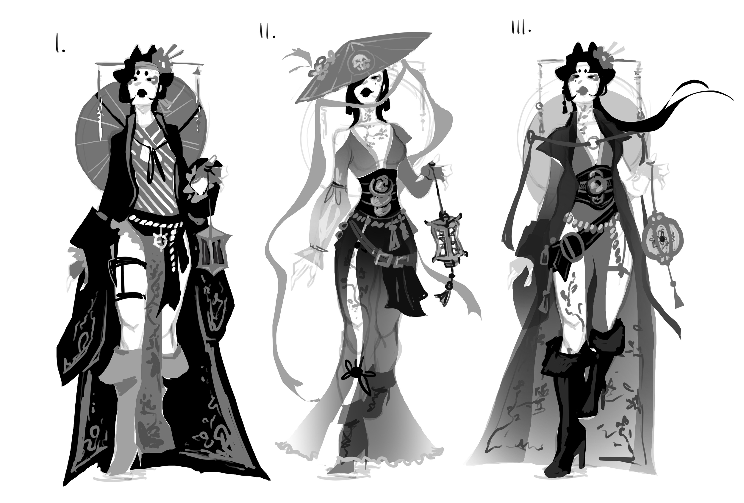 Salut tout le mondes !! je suis parti sur le design de Katryna, d’origine asiatique / japonaise, je trouvais ça intéressant de mélanger la beauté de la culture japonaise, à la piraterie ! voilà mais 3 premiers design, J’aime bien les trois donc jsp vrm lequel choisir je compte sur vous pour me faire part de vos avis !! et sinon je ferais sûrement un mélange en prenant dans chaque, les éléments que j’aime le plus ^^