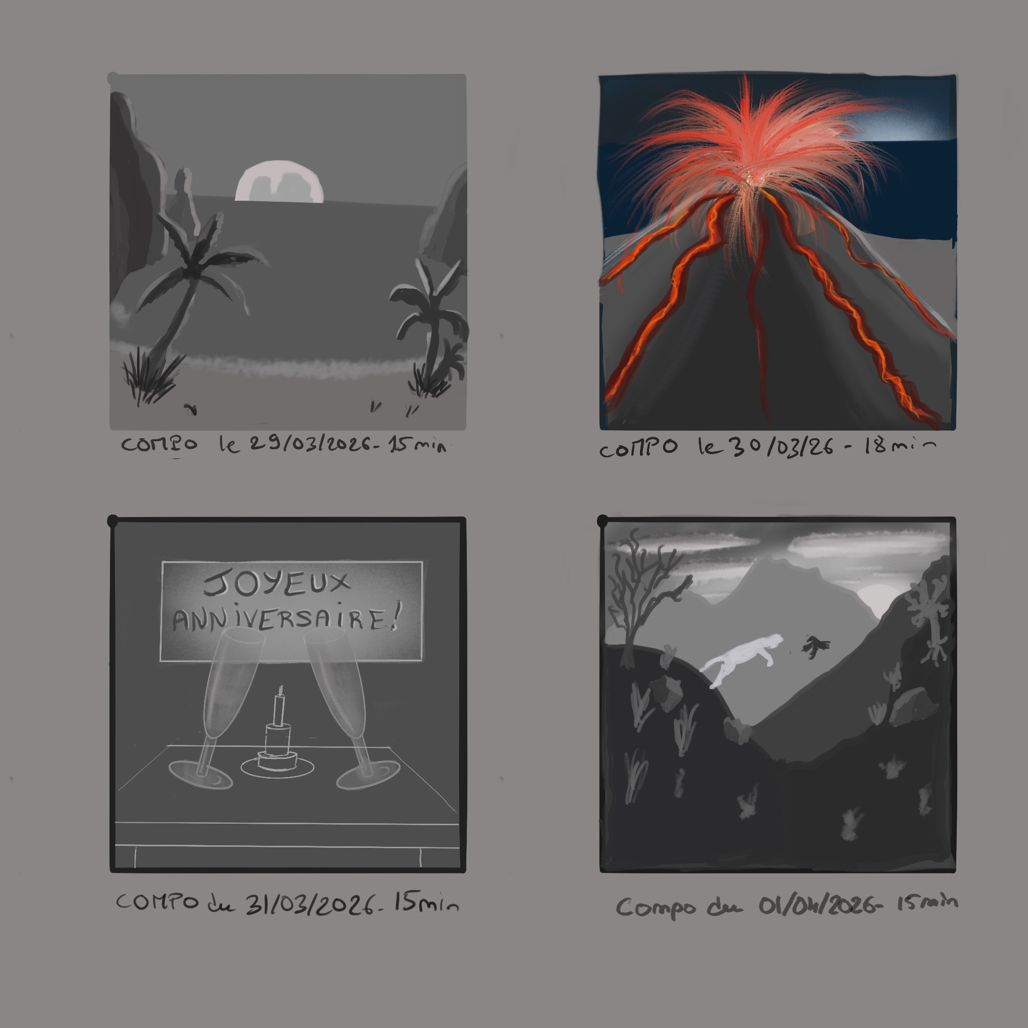 Bonjour à tous, merci pour ce défit, pour ma part j avais commencé un peu avant donc je poste les 4 vignettes de composition des 4 jours… je me rends compte que je ne fais pas grand chose en 15 minutes! Mais c’est un exercice sympas à faire, surtout pour moi qui calcule trop tout le temps, là je me suis donnée le défit de partir d’une page branche sans réfléchir au départ et voir où ça me mène. @ irwin, c est chouette ce que tu arrives à faire en 15 min! Bon défit à tous - Aujourd'hui