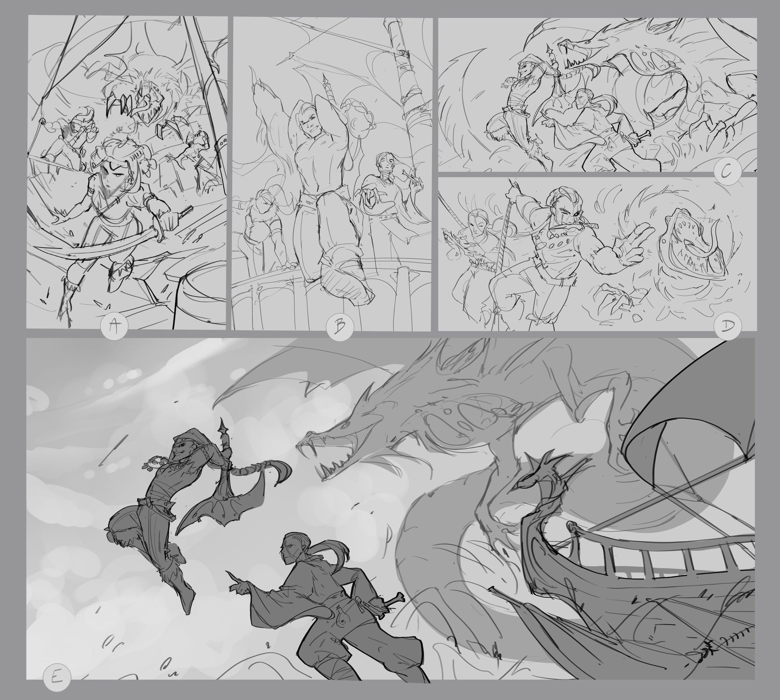 Hello ! Je me lance dans ce défi avec une idée précise : une illustration avec plusieurs personnages, plutôt dynamique. J'aimerais garder l'emphase sur le roi Ivar, afin que l'on ressente sa personnalité et son importance (exception faite pour le sketch "A" où j'ai avant tout réfléchi à la composition plus qu'aux personnages). J'ai envie de me pencher sur un format moins classique, un paysage plutôt étiré pour une composition plus linéaire (E) 🐉