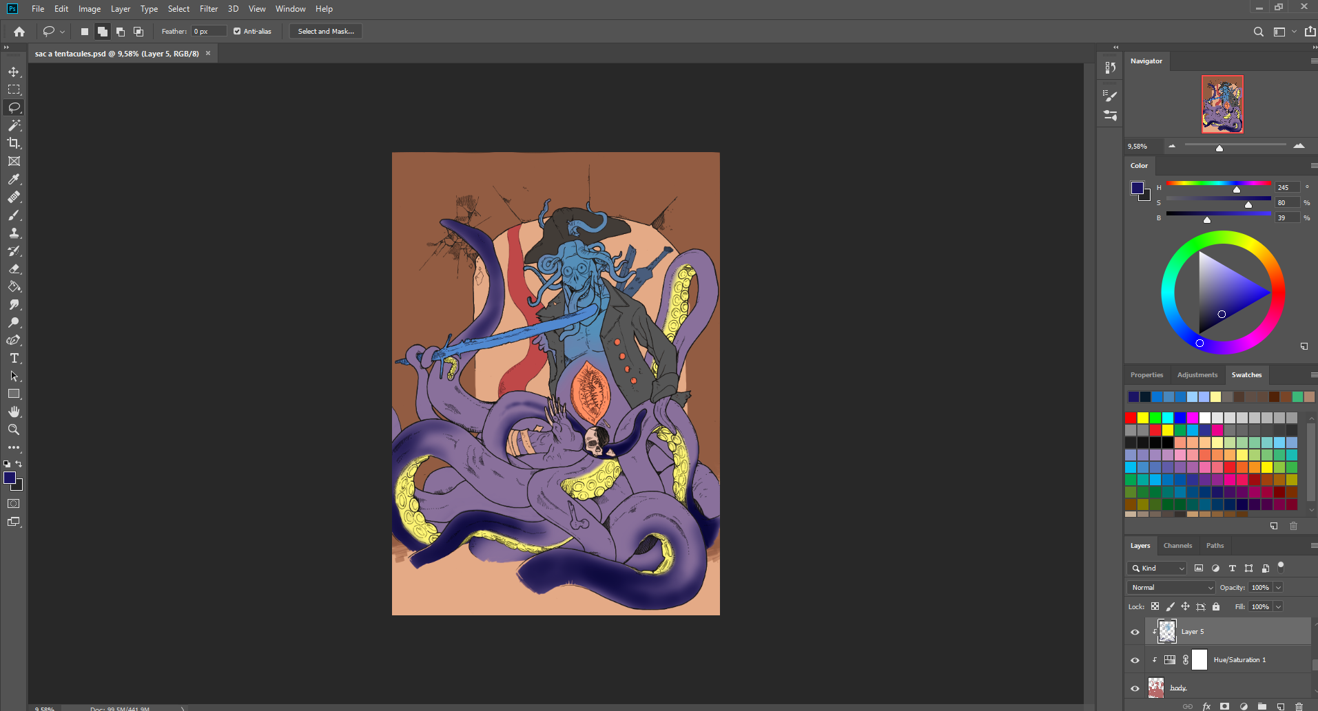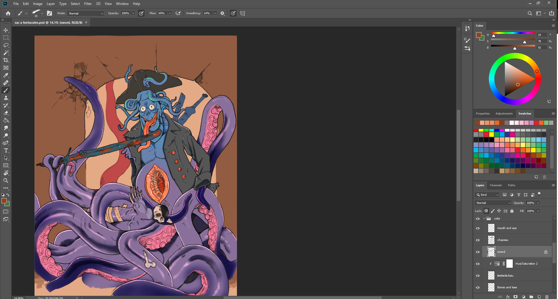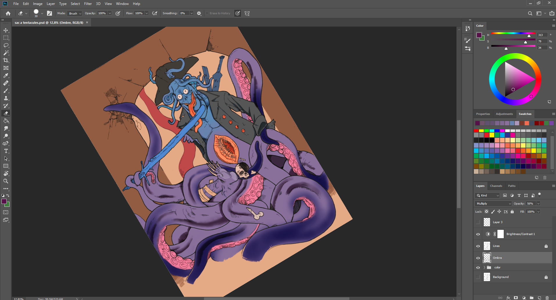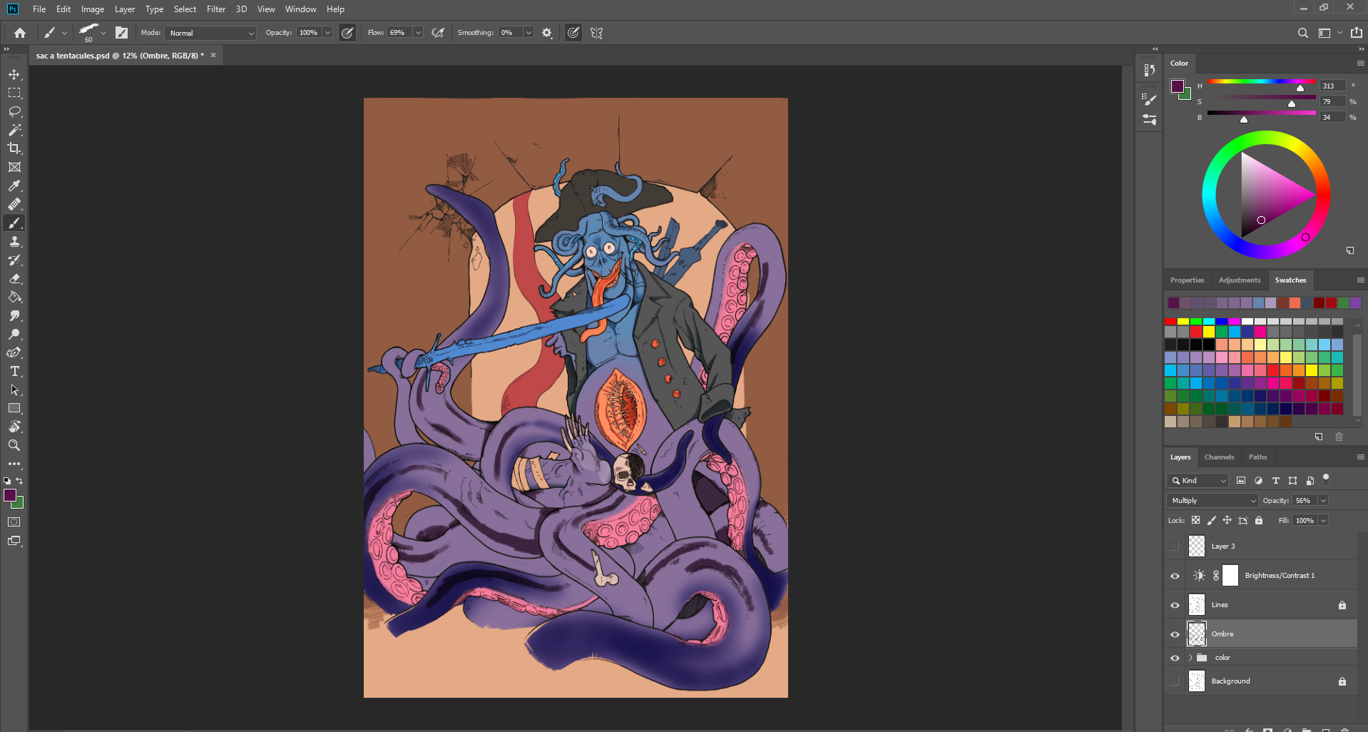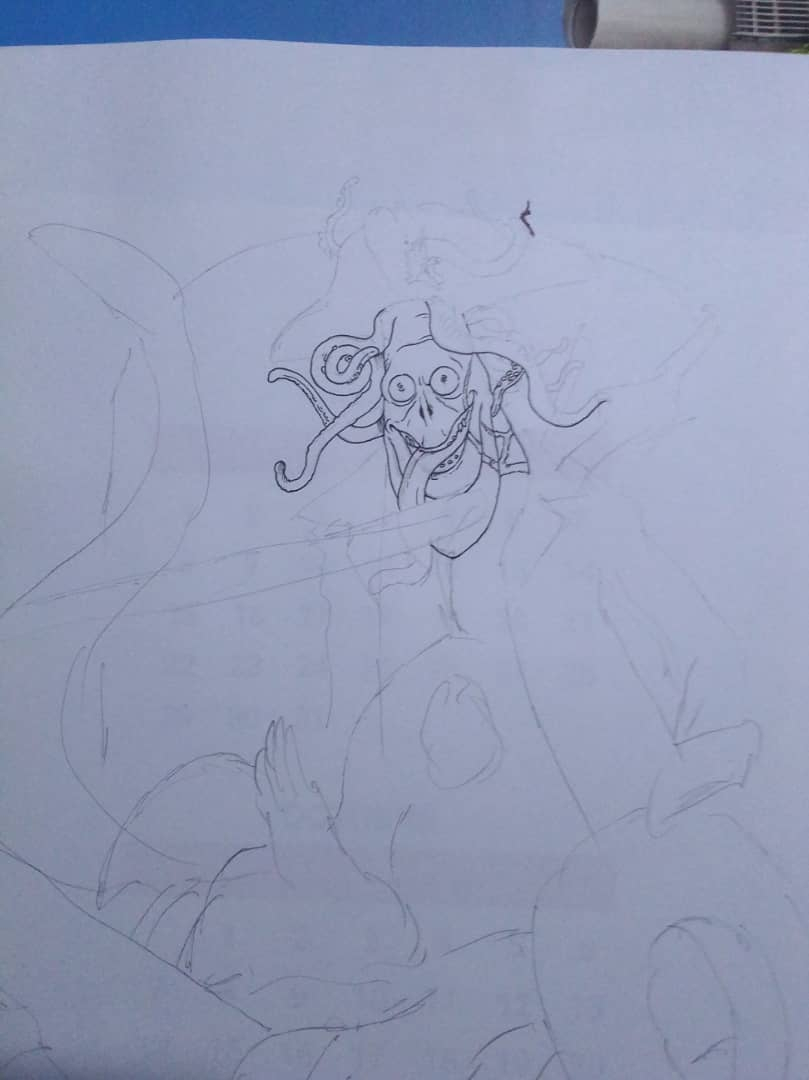 Le trident semblait plus adapté que la bière, puisque son voile finissait avec un filet de pêche. Et voilà, je reconnais que je suis pas mal sortie du cadre, mais tant pis ! Je suis contente d'avoir produit un dessin complet.