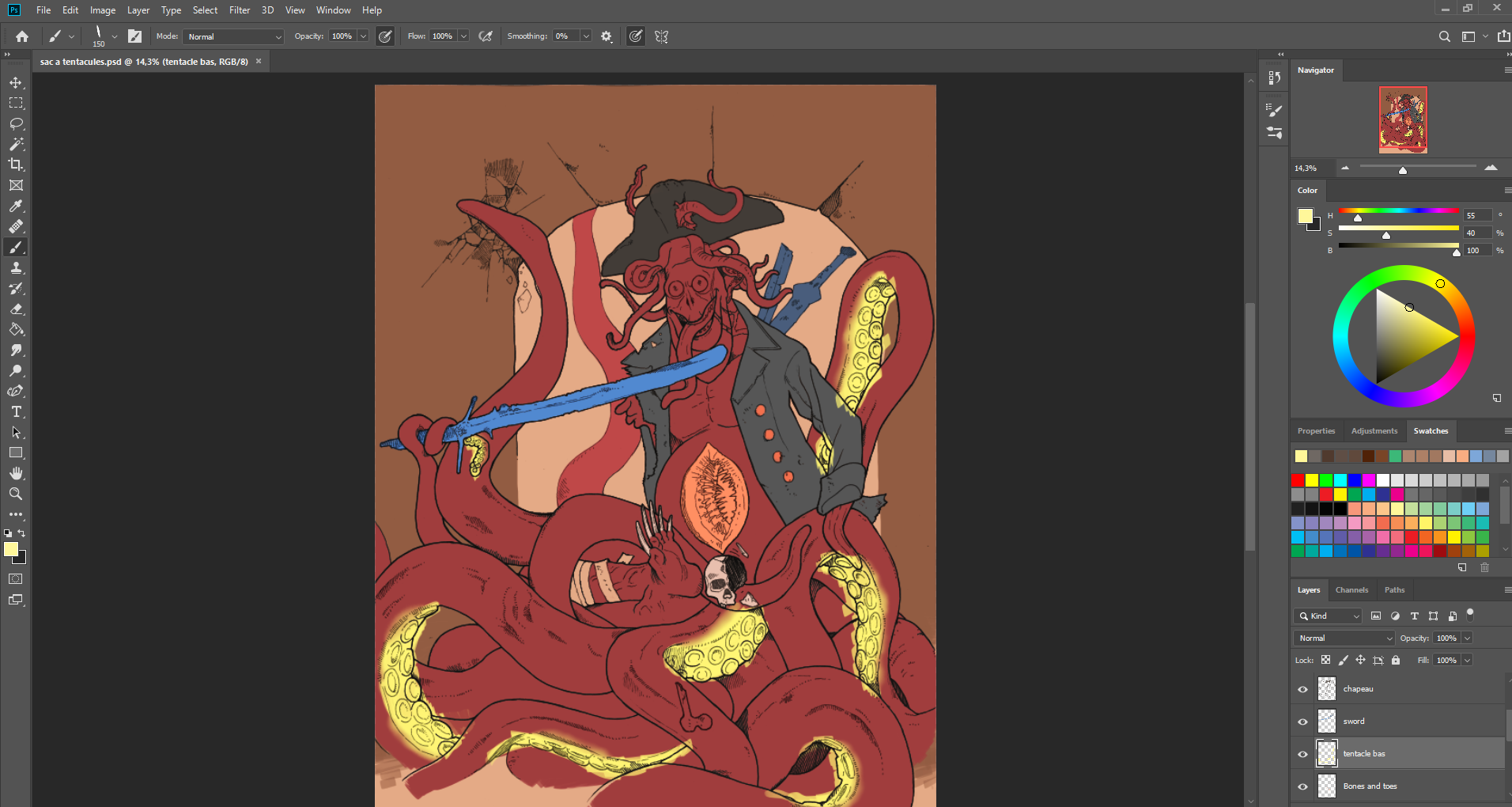Bonjour, Je me présente "Ariod", jeune illustrateur espérant vivre de son art ! Sorti d'école d'art principalement traditionnel. Je tiens à vous remercier pour ce challenge qui m'a appris plein de choses sur mon processus. J'ai essayé de faire au mieux, ayant commencé le numérique, il y a moins d'un an en autodidacte. (en regardant quelques tuto de digital painting school d'ailleurs) Le sujet des pirates déchus m'a beaucoup plu et j'aurais aimé avoir eu le temps de faire plus d'illustrations... Bon au moins j'en ai fait une ! 🙂 Merci à vous ! @__ariod__
