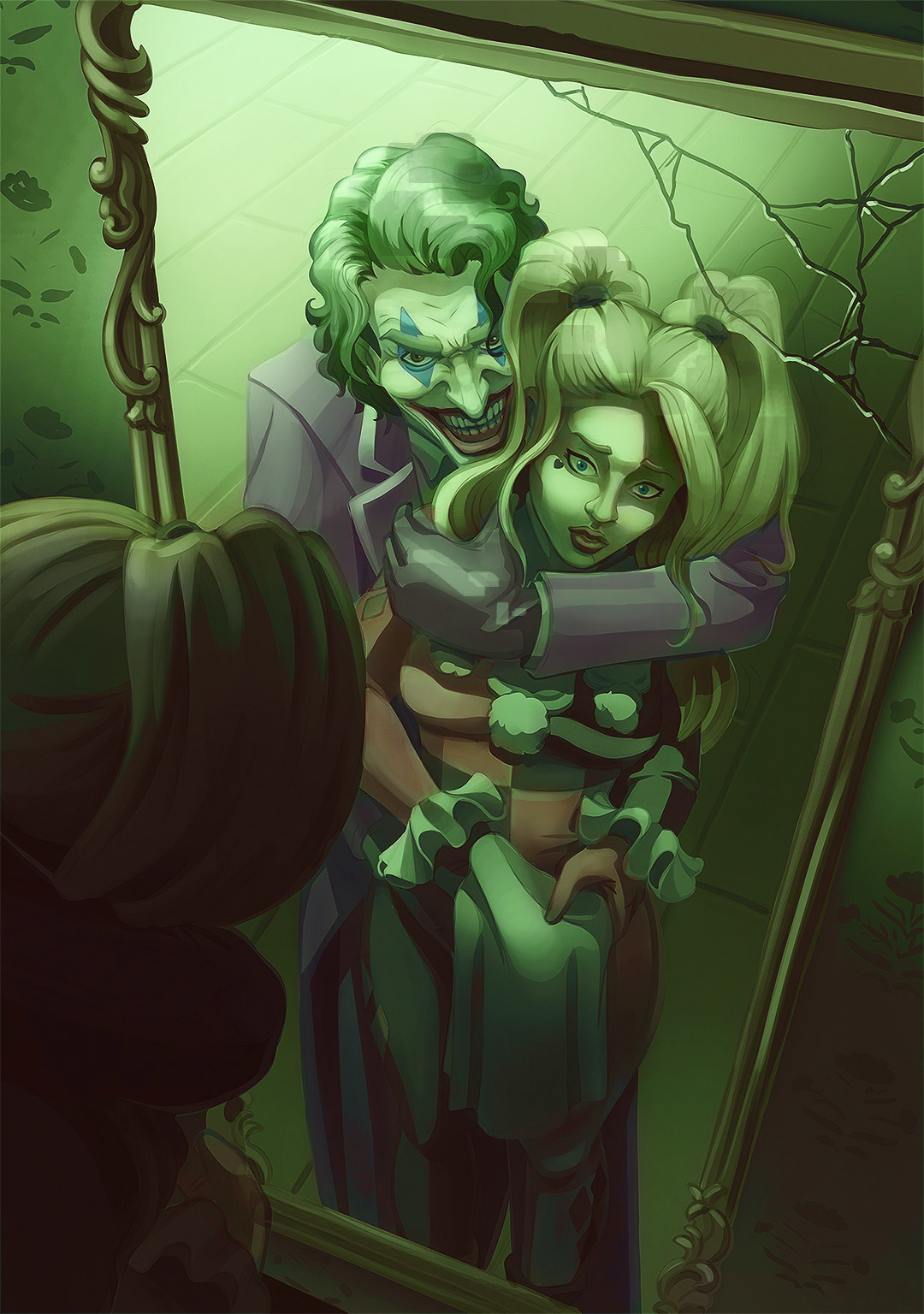 Merci encore pour ta rapidité de réponse @Mael OH! J'ai enfin mis de la couleur avec beaucoup de layers colors. Je ne suis pas sûre de moi mais j'ai voulu rendre cette ambiance malaisante en vert (couleur joker, quoi) mais j'espère que pour toi c'est un bon départ pour que je puisse finaliser. Bref, si tu penses qu'on peu mieux faire, n'hésite pas. Et au final, même si je voudrais m'inspirer de Neskain, je pensais à ajouter du grain pour rendre le coté un peu vintage.