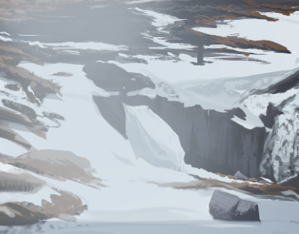 Hello @Nueve désole du délai de réponse yes tu as bien avancé sur cette montagne ! c'est un gros morceau en effet !:) mais tu t'en ai bien sorti malgrès tout ! 🙂 tu peux venir rajouter une teinte plus froide sur ces cascades ici ça manque un peu de roches sur cette partie ta teinte d'herbe ici est un peu trop froide sinon ici tu as une teinte de roche trop chaude tu peux venir la refroidir et l'estomper dans le brouillard sinon c'est good continue !