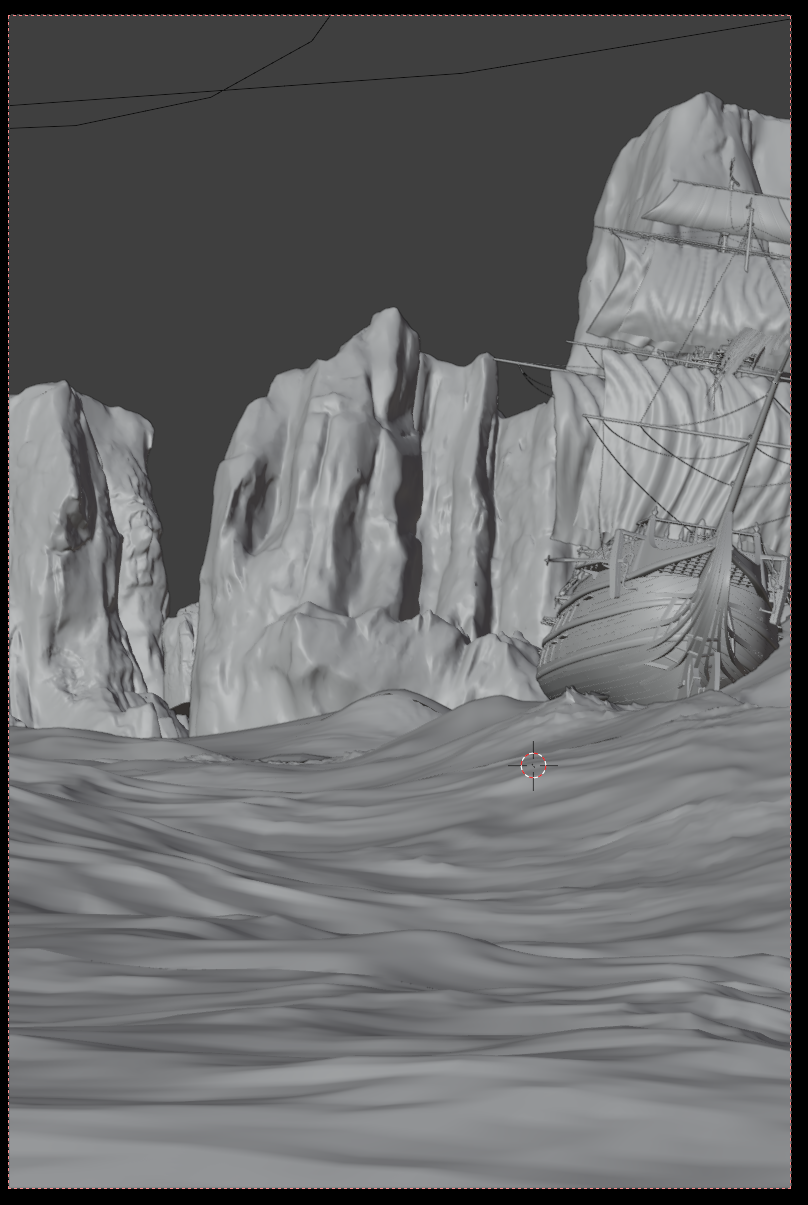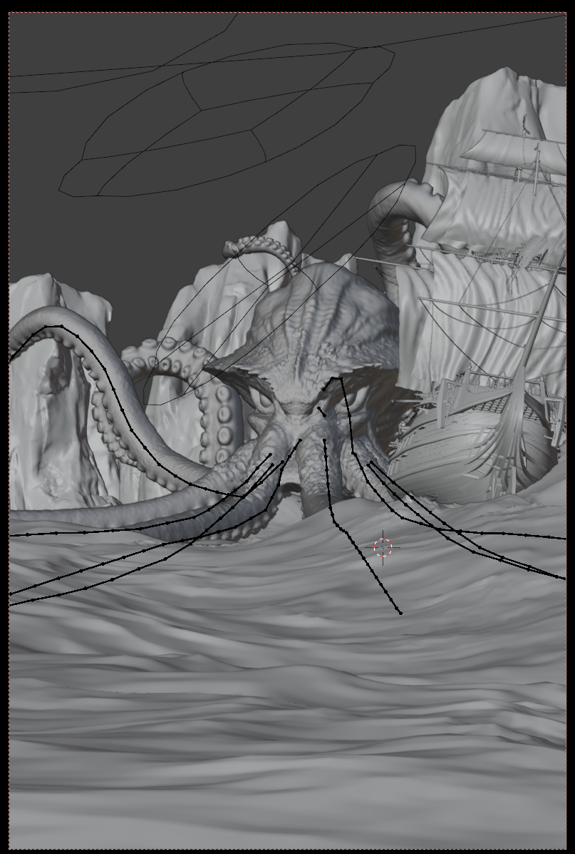 Bon faut que je me sorte les doigts! J'ai donc fini l'env: Ce qui donne avec le kraken: Je pense que je vais mettre un bateau sur le premier plan avec plus de tentacules. On n'a jamais assez de tentacules! -