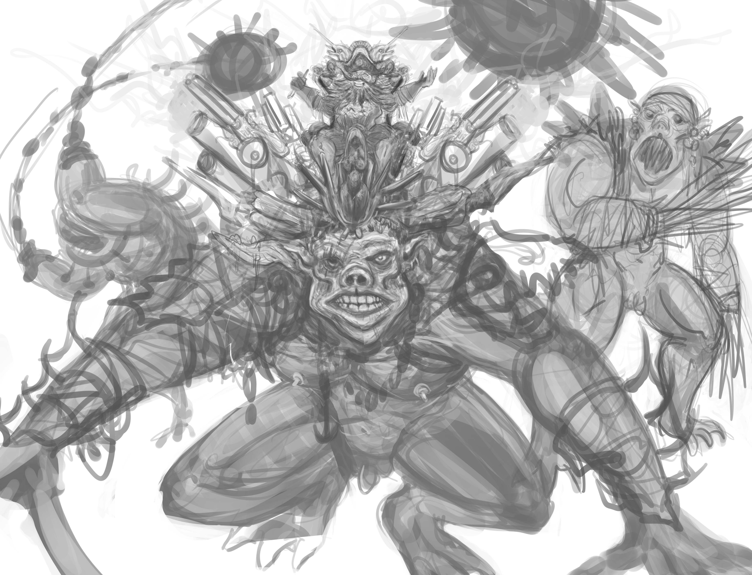 Salut Fomw ;o) Belle progression effectivement depuis ton début de recherche. J’aime beaucoup la partie sous marine, la lumière est sympa même si globalement on est un peu trop dans les gris. J’aima bien aussi les mouvements des tentacules, on sent bien l’agitation. Sinon, pour la compo, je trouve que le ligne d’eau est trop horizontale et coupe l’image en deux moitiés égales. Si tu conserves cette ligne horizontale j’opterais pour un parti pris ciel ou mer. C’est à dire avoir un tier de mer et deux tiers de ciel ou l’inverse selon le parti pris. sinon, comme on imagine la mer bien agitée je te proposerais la ligne de partage un peu plus ondulée. avec aussi des éléments en premier plan (tentacules, éléments brisés de bateaux, membres de matelots ;0) etc pour créer un peu de profondeur et nous immerger un peu plus. À moins bien sûr que ton choix soit un plan large sur la mer immense. Il faudra donner un peu d’épaisseur à l’eau là où elle se soulève et rajouter des caustiques sur les éléments immergés Et dans le ciel je te propose de remettre du ciel sombre au-dessus de tes zones orageuses afin que celles-ci ne soient pas coupées et ne dirigent le regard en dehors du cadre. Voilà, bonne continuation, à plus .